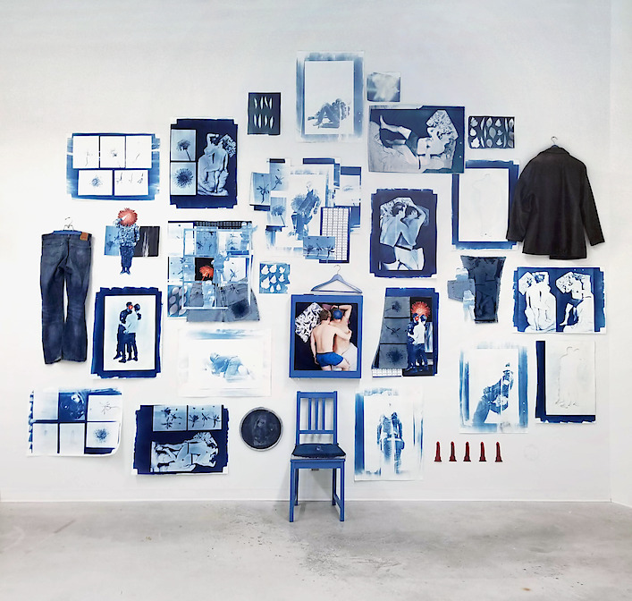 Manitoba winner Gabriel Roberts, University of Manitoba, A Closet Painted Blue, cyanotype on paper, linen, denim, cushions, leather, digital prints, chair, overall 100 × 100 × 16 in