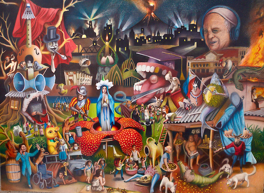 The influence and subversion of Hieronymous Bosch is not to be missed in Rey Francis Dominic B. Tatad’s Chosen Land. This year’s Saskatchewan winner sees heavy influence in the early Netherlandish painter’s complex imagery and use of vibrant colour, yet whereas Bosch overlaid his works with fantastic religious figures, Tatad diffused his with socio-political overtones akin to his Filipino identity, ultimately overthrowing the Western hegemony underpinning his work. In itself, the significance of religious and political Filipino narratives existing within a style informed by Western influences represents an encapsulation of Filipino history mired with centuries of colonial abuse. Tatad’s Chosen Land is masterful and electrifying for its ability to confront Filipino history while subverting Western artistic influences.