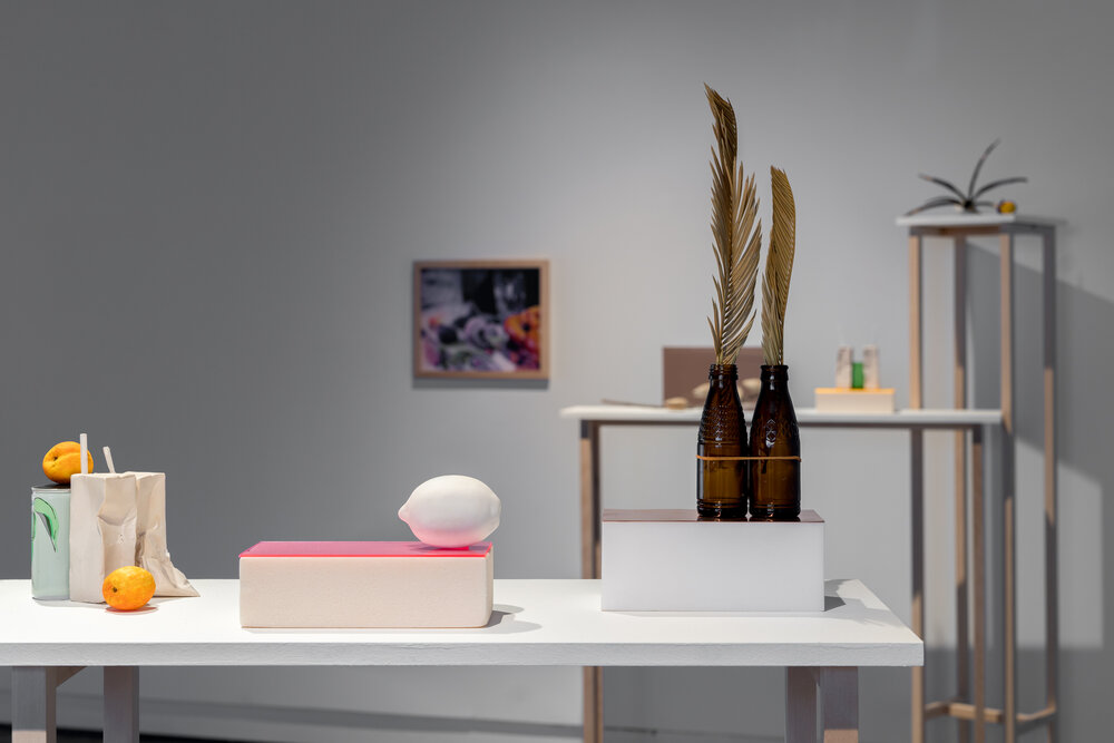 Belliveau’s still life installations are an eclectic combination of found objects, sculptures, 3D prints, and lenticular prints. My favorite surprises among the objects found in this exhibit include: flowers displayed in a yoghurt tub, a dried orange slice, seashells, 3D printed models of fruits including a pure white lemon, and a single bronze nut.