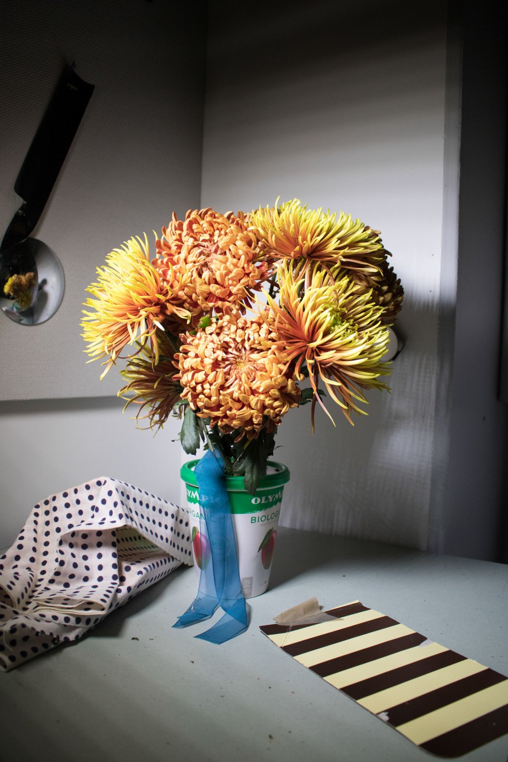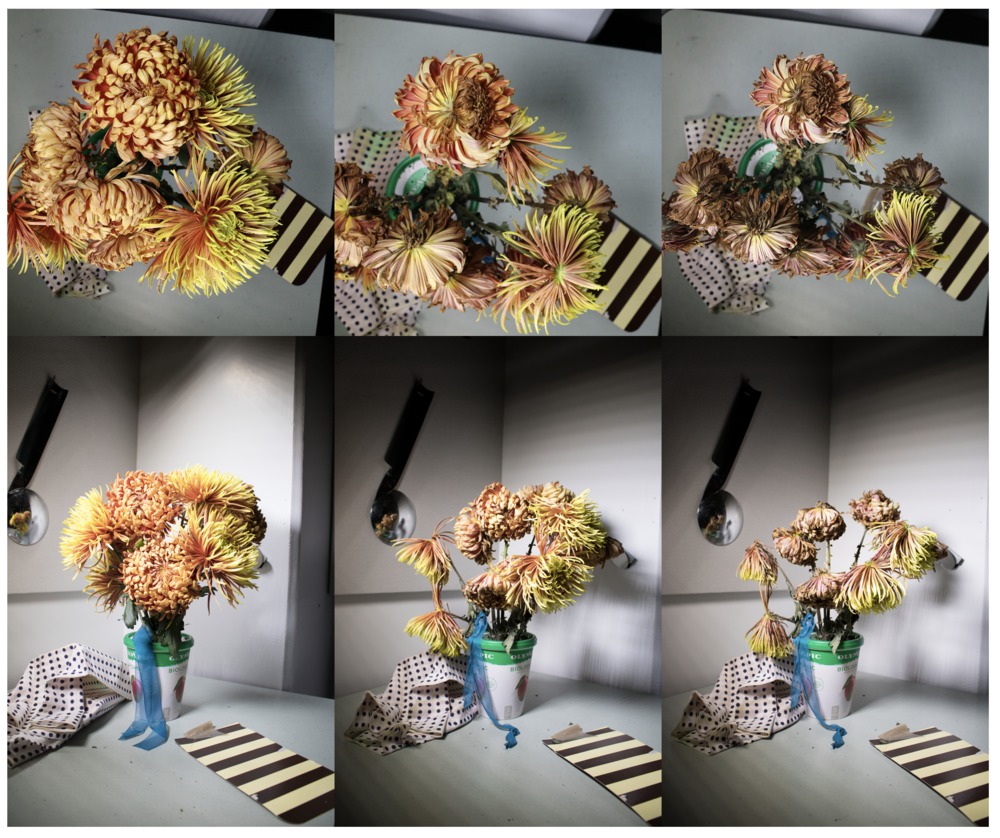 Belliveau explained that her time lapses collaborate with time, enabling the observance of living things that perform in front of the lens. It seems that Belliveau treats time as an independent entity, one that she leaves to its own devices and artistic choices. The time lapses are projected onto the walls of the gallery, demanding attention from the viewer with their monumental size. A section in the time lapse, Gift features the decay of flowers inside a yoghurt container which allows the viewer to see the flowers’ last dance before wilting completely.