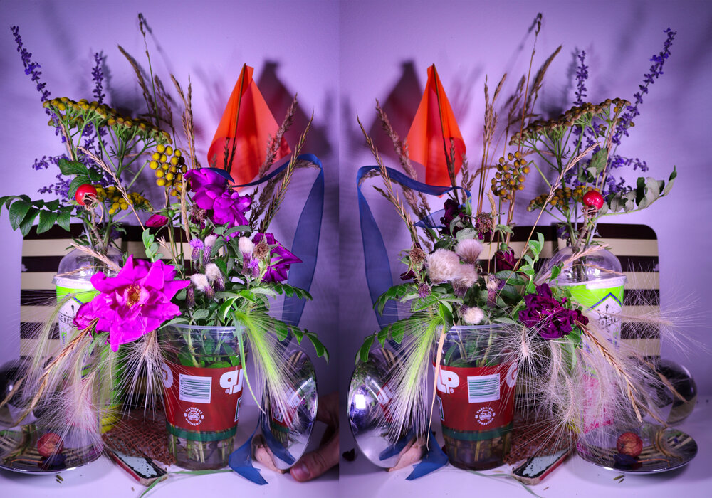 This exhibit is highly reliant on one being in the presence of the objects. The lenticular still life prints are only fully understood by the viewer who walks around them. Lenticular prints have the unique quality of being made up of multi-layered stills, so when one moves past the work the visible layer changes, allowing one to transition through the stills as the viewing angle changes.