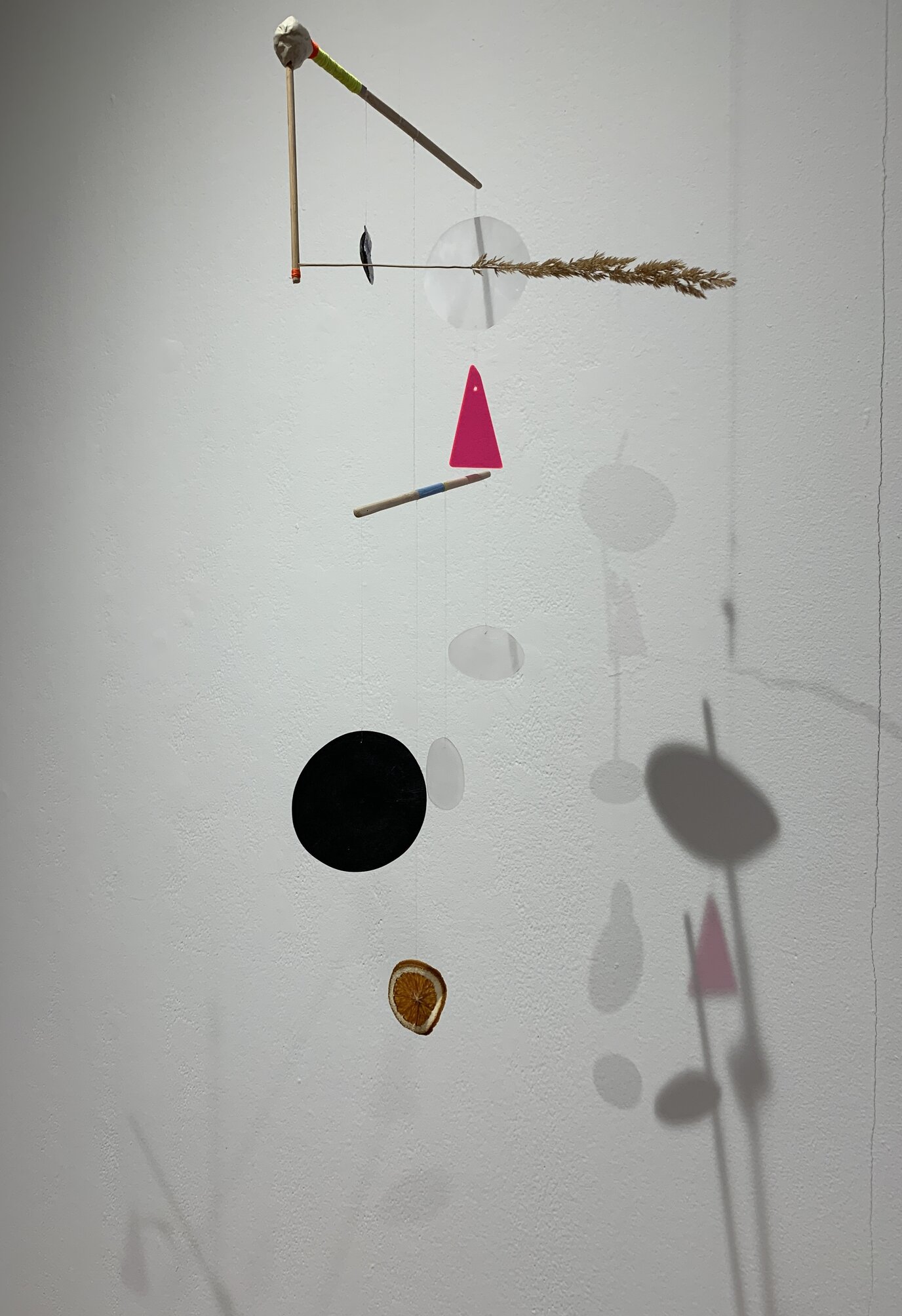 In her artist talk, Belliveau also commented about working on the project during quarantine. She explained that being confined to her living space brought to her attention her limited access to objects; that she had to use items inside versus outside of her home. She recalled that on some days the only things that came through her door were take-out boxes, which have been integrated into the installations. For instance, Belliveau’s mobile installation, Prairie-studio practice for self-isolation, hangs collected objects from the ceiling with strings, including sanded down take-out containers, which gives the work liveliness and movement. Belliveau said that the mobiles acted as a form of company, as she shared her space with a sole house plant. It is then fitting, as she mentions, that this exhibition is titled Alone in the House. The works are a culmination and memorialization of the items that gave her company during a time of isolation.