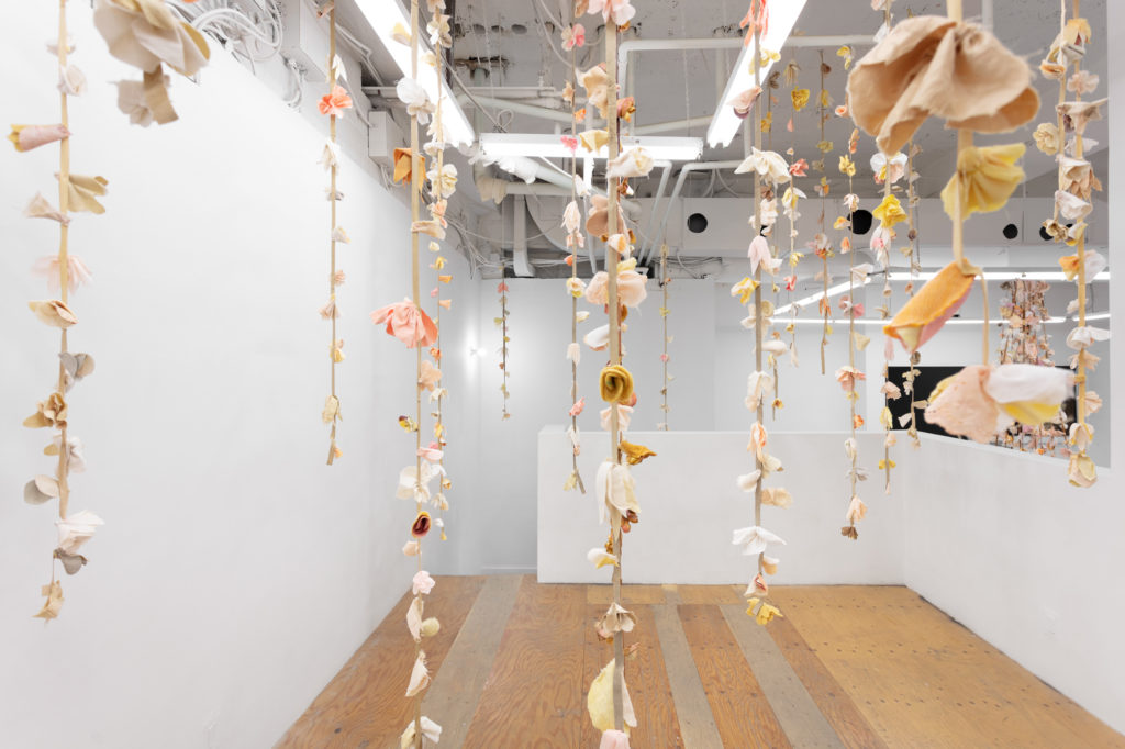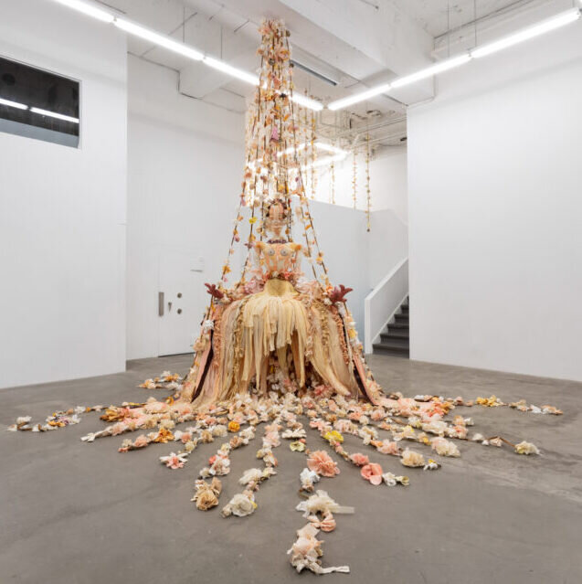 The quantity of physical and emotional labour put into this work can be detected in the intimacy and care evident in every detail. Lewis began collecting and dying fabrics approximately one year before the exhibition, some materials having been gathered and held onto from much earlier. The result is an environment that appears to be in constant transformation yet also seems to have existed forever. In conversation with Cooper Cole, Lewis shares her connection with upcycled materials, “I feel like I’m a treasure hunter… That’s been a part of my life since childhood.” In her artwork, Lewis uses second-hand clothes, textile waste, gathered shells, and even sacrifices personal jewelry all in the name of sharing the love and lives of the items’ previous owners.