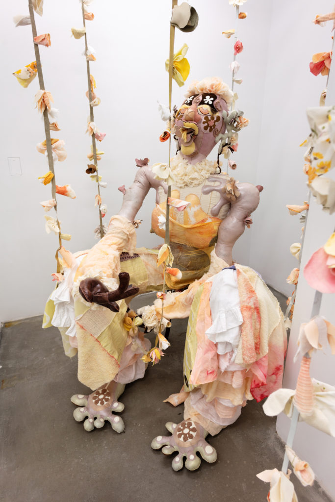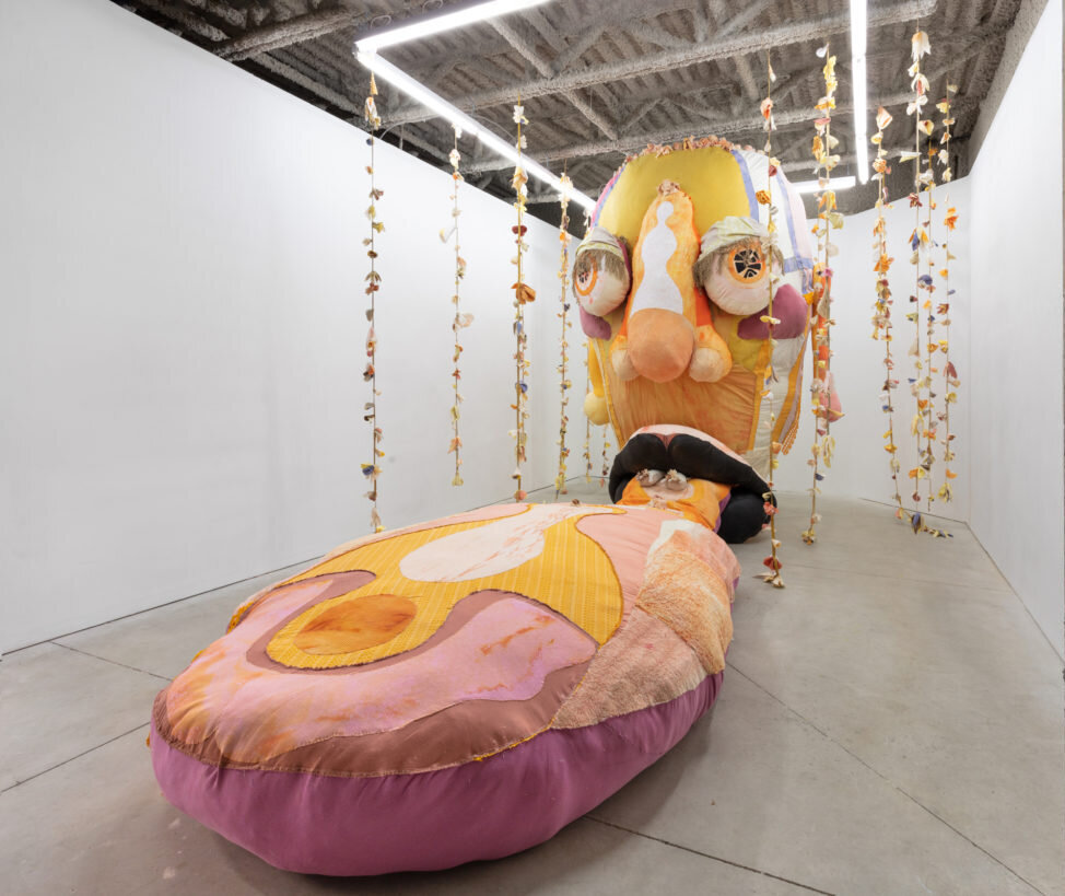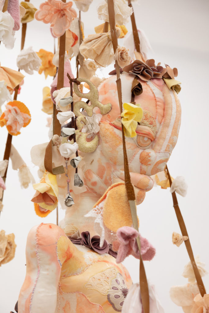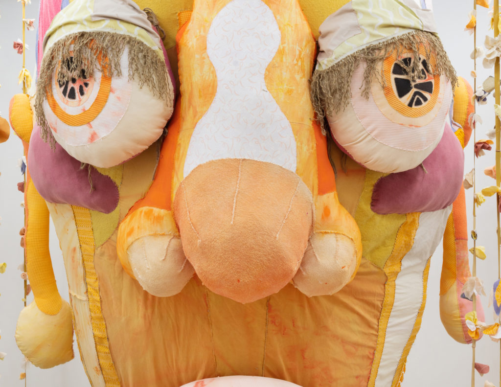 Another “motherly overlord,” Opus (The Ovule) is a towering head with bright discerning eyes and a tongue extended forward. A head so large in scale can’t help but impose a sense of endless and eternal wisdom. Indeed, in the realm of the T.A.U.B.I.S. the Ovule is an essential but vulnerable source of knowledge and power. Lewis began work on this figure in 2017 in Kingston, Ontario, collecting textiles but limited by the few objects accessible to her there. “Opus slept for a couple of years,” says Lewis, and here the figure finally emerges in this 2020 exhibition.