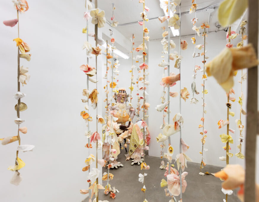 Tau Lewis’ solo exhibition at Cooper Cole, Triumphant Alliance of the Ubiquitous Blossoms of Incarnate Souls, explores a paradisiacal world both timeless and tethered to this one. Lewis generates the realm of the T.A.U.B.I.S. at Cooper Cole “to explore desires for abundance, safety, deep roots, and justice.” Sectioned around three figures, Lewis has hand-stitched and hand-dyed upcycled materials into unforgettable textile sculptures. Though in-person viewing was cut short by Toronto’s lockdown restrictions, in its final week, the realm of T.A.U.B.I.S. was accessible by gazing through the well-lit windows of Cooper Cole.