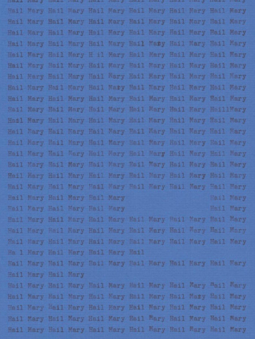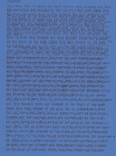 Between these videos are more scans of the typed ‘Hail Mary’, not including all lines of the prayer but enough to identify it. Eventually the layers grow denser as the lines pile on, and the words seem typed in bold letters, consisting solely of capitals. The words become lost along the way, a recital that shifts or becomes detached from its initial intent. It becomes more difficult to discern which line is written and the names are harder to identify as capitals aren’t readily used. Keys are held, taking up nearly a whole line for the letter ‘l’ or ‘r’, emphasizing words through repetitive taps of the selection. That repetition in the form of taps, or lines, or the prayer as a whole, weaves its way throughout the project.