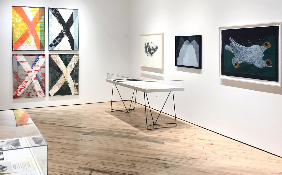 Installation view of the Archive Exhibition, PRESS RECORD: Prints from the Open Studio Archive, January 10 – February 8, 2020, with works by (L-R): Vera Frenkel, Gordon Smith, Sameer Farooq, Tim Pitsiulak and Micah Lexier (vitrine).