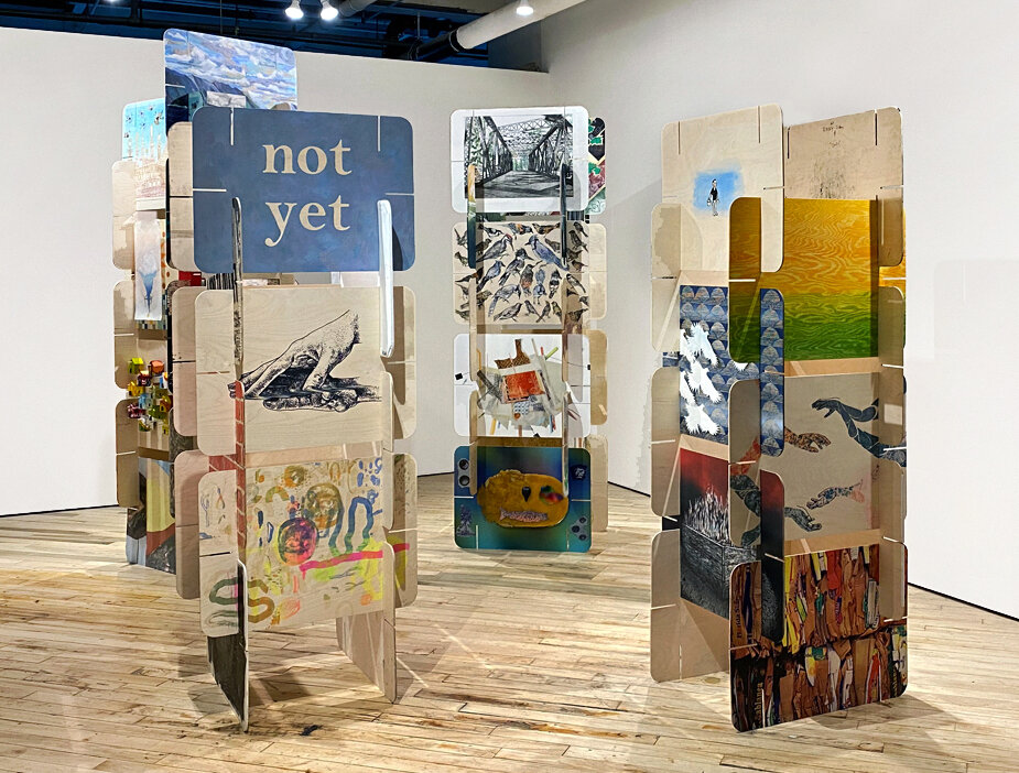 Our current exhibition Murmuration celebrates Open Studio’s current community and takes print to a sculptural realm with artists printing onto wooden boards that are slotted together to create three-dimensional structures. We have also just opened another public art exhibition in collaboration with Lake Effect Projects, which sees prints by four artists enlarged to billboard scale at the Jack Layton Ferry Terminal, and continues into the summer. In the fall of 2020 we hosted our first ever online fundraiser called Future Proof, which celebrated Open Studio’s golden anniversary, and helped us in securing our future too.