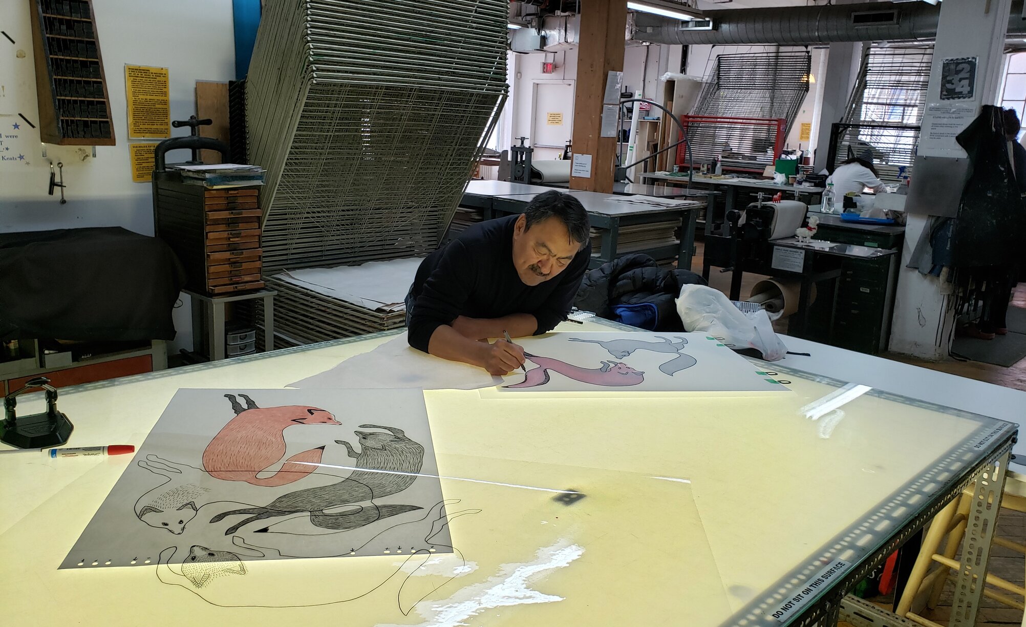 AG-T: Yes, we had lots of events planned for our 50th celebration. One of the big events in the studio was hosting our annual Inuit Artist Creative Residency in partnership with The West Baffin Eskimo Cooperative and Dorset Fine Arts. In February 2020, artist Quvianaqtuk Pudlat worked with collaborative printers Nick Shick and Jessica Palmer to create two beautiful screen prints.