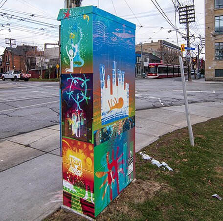 RT: We juried for the twelve Open Studio artist designs with the city’s leads on the StreetART project, Jason Campbell and Catherine Campbell, and an artist with connections to Open Studio. As a jury, we took into consideration the city’s mandate for diversity, visual boldness, and the adaptability of the design to the traffic box structure. We also considered how the box designs might deter graffiti and their connection to narratives around Toronto. When working out where different artist designs would be positioned in terms of the boxes available to us, consideration was taken for how the design would relate or provide apt juxtaposition to their site.