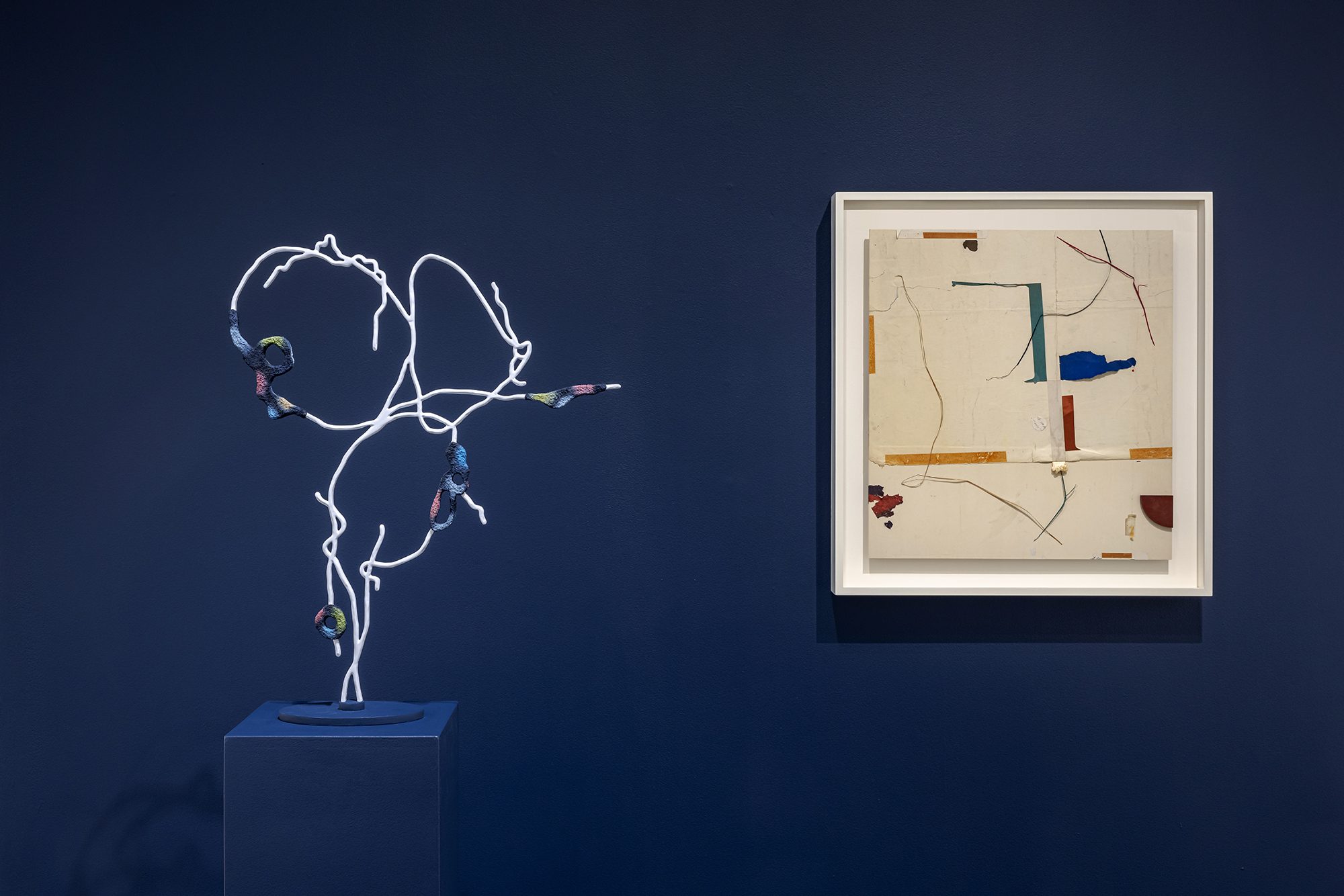 The other line sculpture, “the ten of wands works best as a coaster for a mug half full” (2020) is composed of similar materials. This sculpture’s white lines intertwine around circular areas, revealing three approximate circles of negative space as satisfying to focus on as the lines themselves. A few identifiable patterns give the sculpture a near-humanoid appearance. A face-like shape appears on the top. A hand or a foot can be discerned in the line that juts out to the right and points to the adjacent artwork. But the intertwined lines don’t always form expected patterns, reminding us that this is not really a human but perhaps grouped traces of human movement.