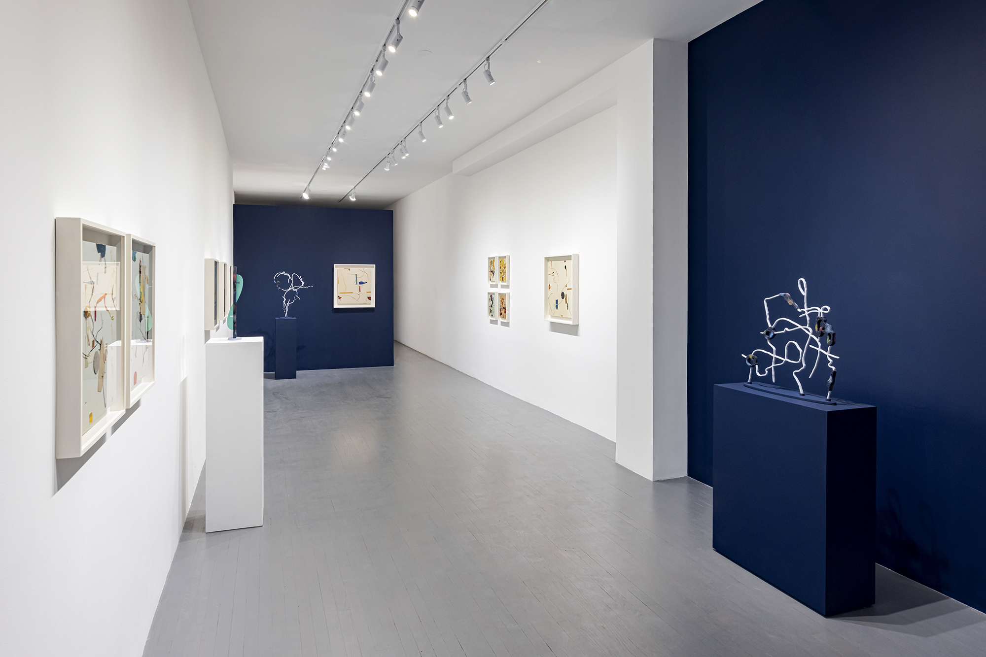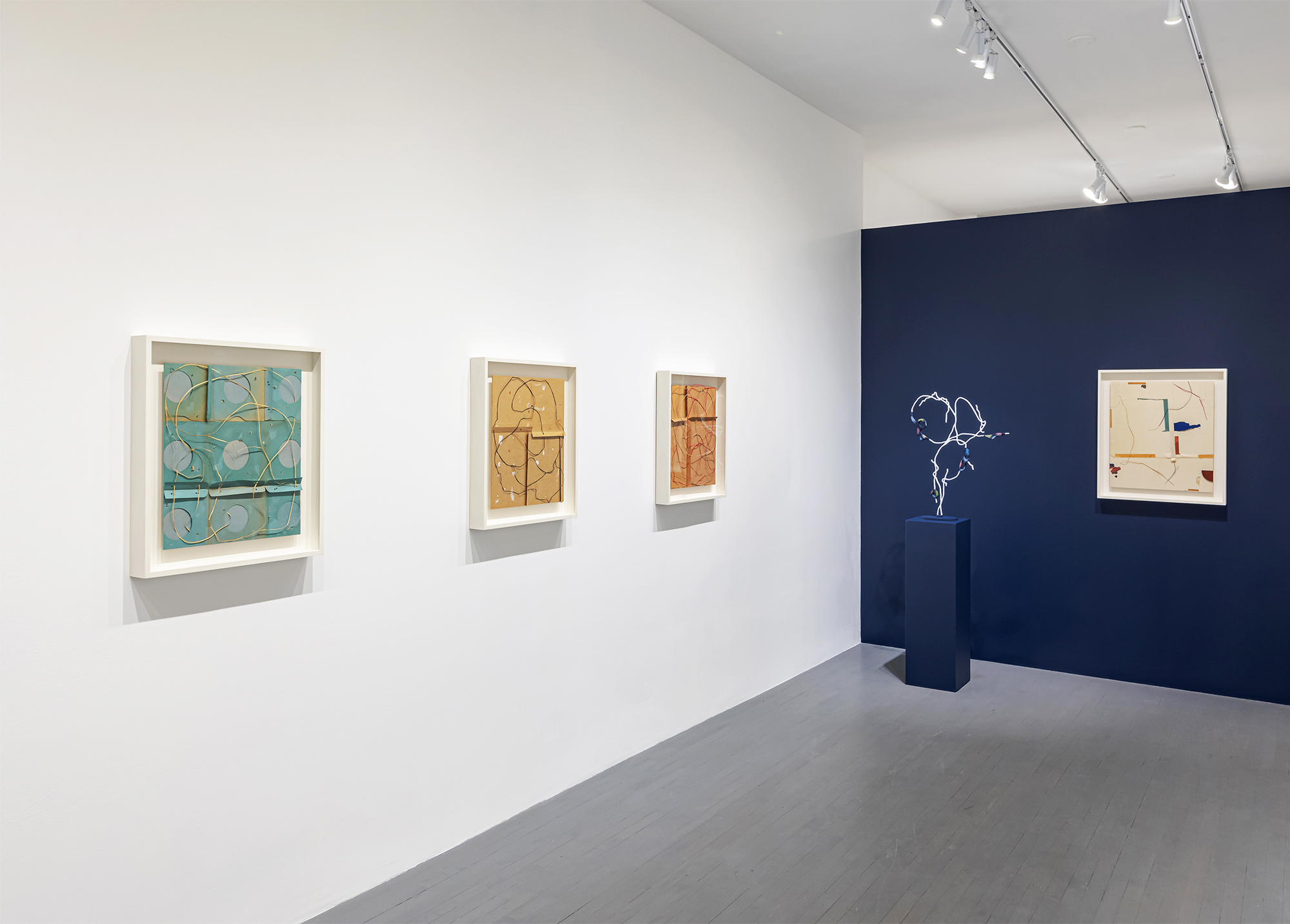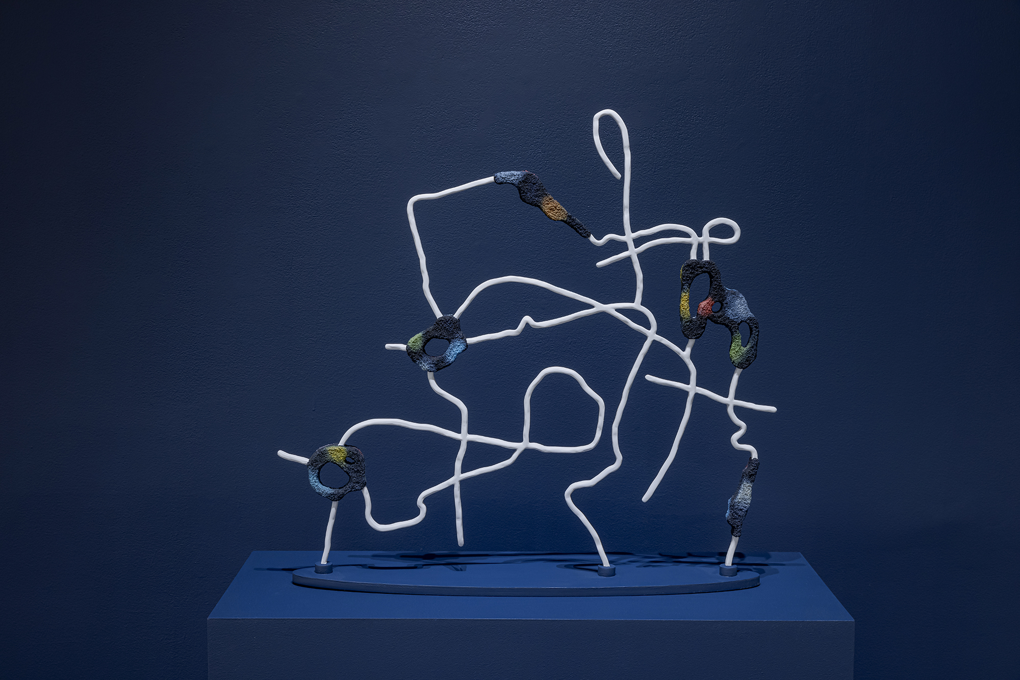 The line sculpture, “precious meddles” (2020) was inspired by a collection of wires found by Whibley around Toronto construction sites. White lines contrast the dark navy gallery wall, forging clear paths that wander off and collide. The round organic shapes that fuse the lines together are less clearly defined against the navy background in shades of blues, yellows, and greens. Some lines split and diverge, others are nearly unbroken from start to finish. All lines connect eventually at junctions that give “precious meddles” the appearance of a warped subway map. This comparison makes for a surprisingly apt embodiment of entanglement. Multiple states of subway maps exist in imagined expansion projects that will never be and in the construction plans that have taken so long to complete they seem to have always been in construction. Transit and urban planning are worlds of colluding pasts, presents, and futures.