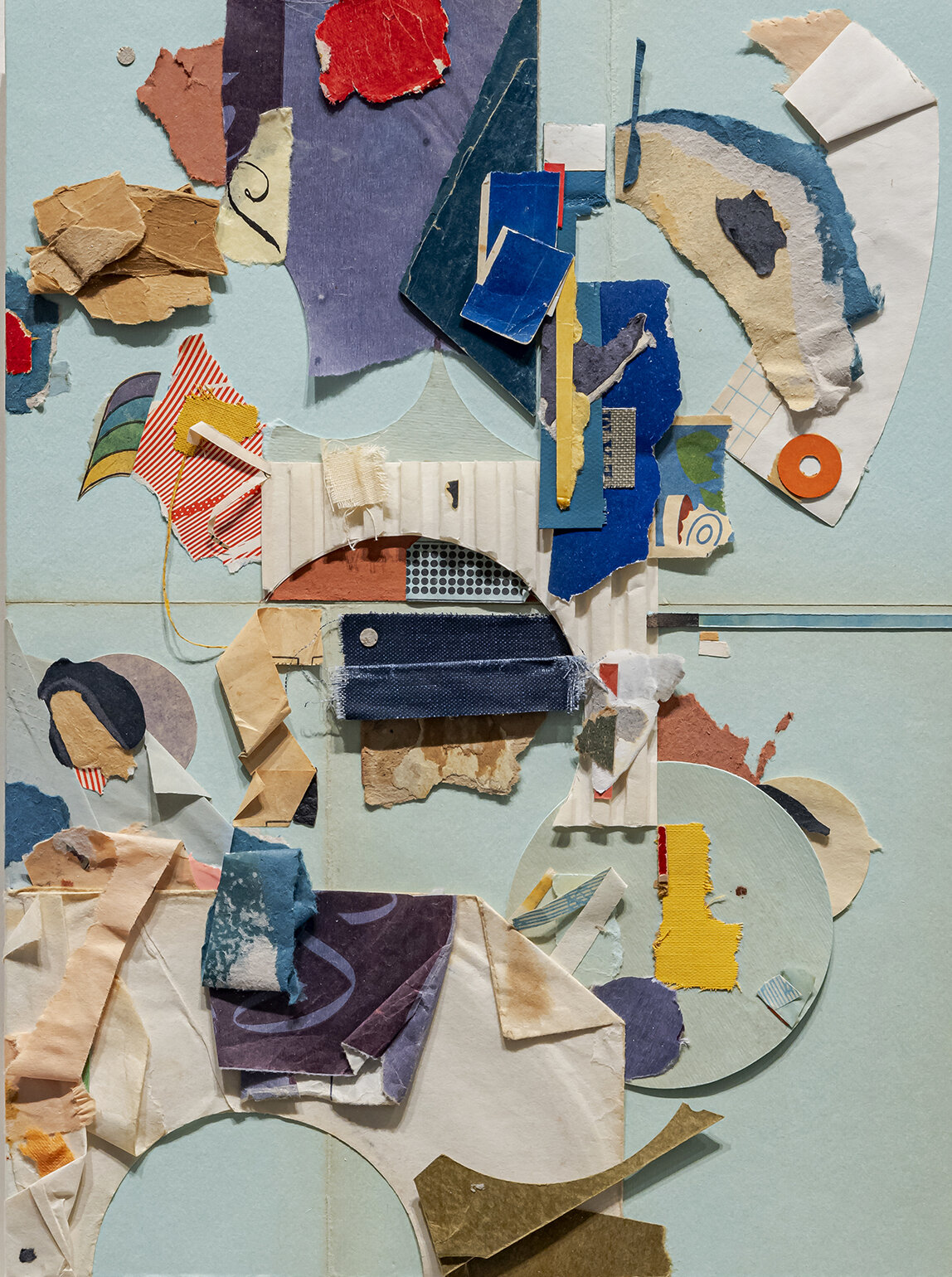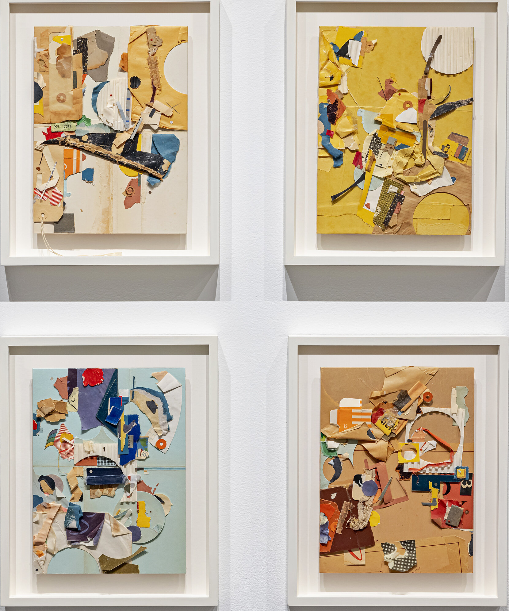 A series of four collages show Whibley’s collected materials densely packed together, off-shooting fissures of negative space. All four works have familial traits of circular caverns, shared materials, and hues of mint and beige. The materials used in these collages—an envelope, denim, scraps of stationary—lend the works a lived-in appearance. By grouping these materials together, Whibley has recontextualized them, linking them to the places, times, and memories of their neighbours. In this way, we see before our eyes that a single entity can exist in multiple times and spaces at once.
