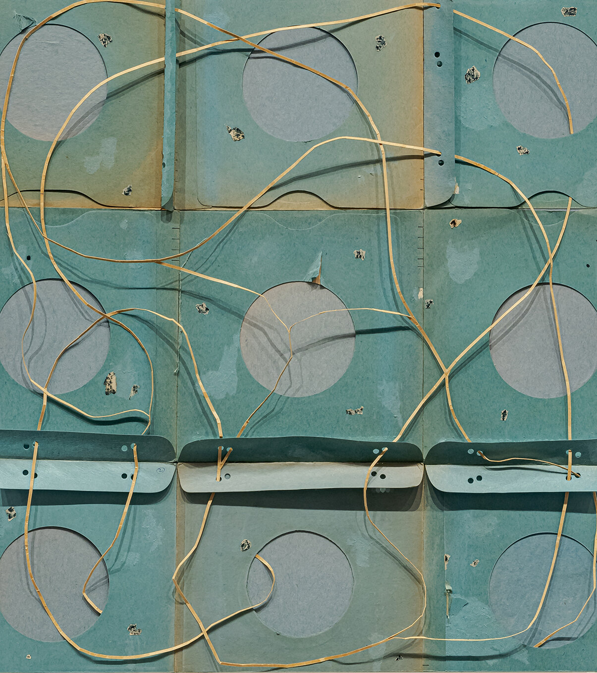 “water closes around a sinking object like an eyelid” (2020) is composed of gold strips of paper threaded over and through a mint-coloured field. Two other works in this series feature similar long, thin pieces of paper that track and tangle around the surface. With entanglements in mind, some questions arise: do these lines represent the traces of paths taken, possible paths, or desired paths? Could they represent all of these at once?