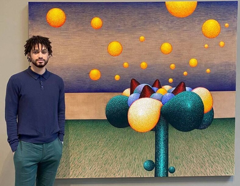 Christian Butterfield in front of Apology Flower #8 (across the bay), 2021, acrylic on linen, 84 x 72. Photo: Georgia Gardner