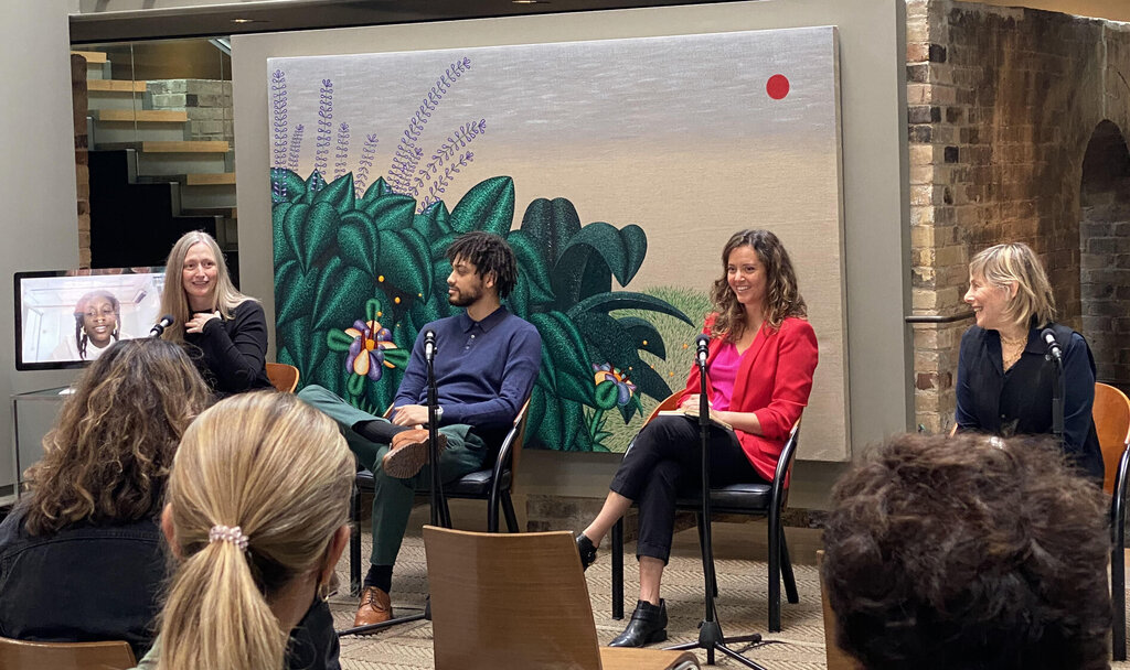 L-R: Artist, Anique Jordan (who attended virtually on that screen), Dr. Sarah Stanners, Christian Butterfield, Dr. Renata Azevedo Moreira, and Jane Corkin. Photo: Georgia Gardner