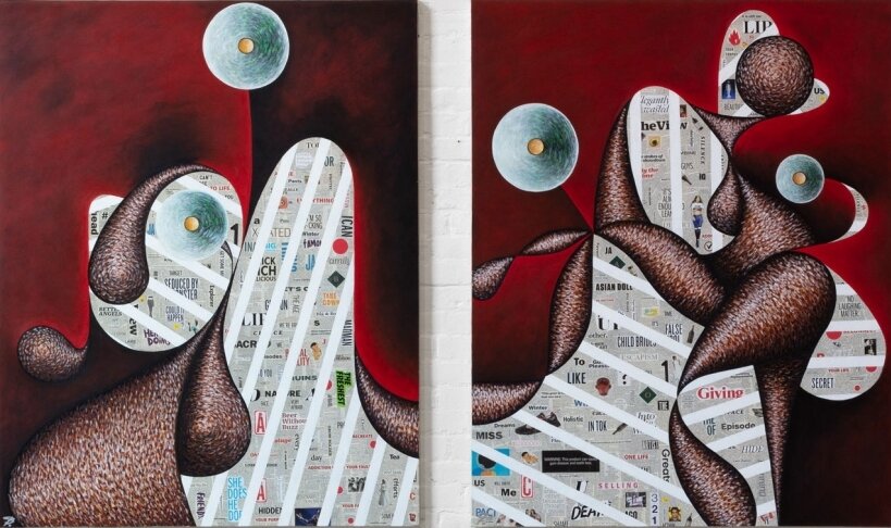 In terms of artistic process, he uses newspaper clippings as a way to respond to the oversaturation of media that has bombarded his generation, as someone who has grown up alongside the digital age. He layers selected newsprint clippings and fragments from publications, frequently sourced from the pages of Time Magazine, onto his painted canvas. The results are works that contrast order and disorder. The placement of the media is purposeful, and his painting style is a meticulous endeavor of sculpted geometric shapes and colours. Each media element is a declaration of consumer culture, societal pressure, or strain in an interpersonal relationship, engaging viewers in a process of vulnerability and reflection.