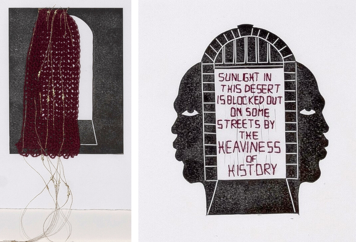 Eva Birhanu and Khadijah Morley, Portals to Our Liberated Futures, 2021, Kozuke Paper, ink, gold thread, 8.5″ x 11” (left) & Portals to Our Liberated Futures, 2021, Strathmore 300 lightweight paper, ink, red thread, 9″ x 12” (right)