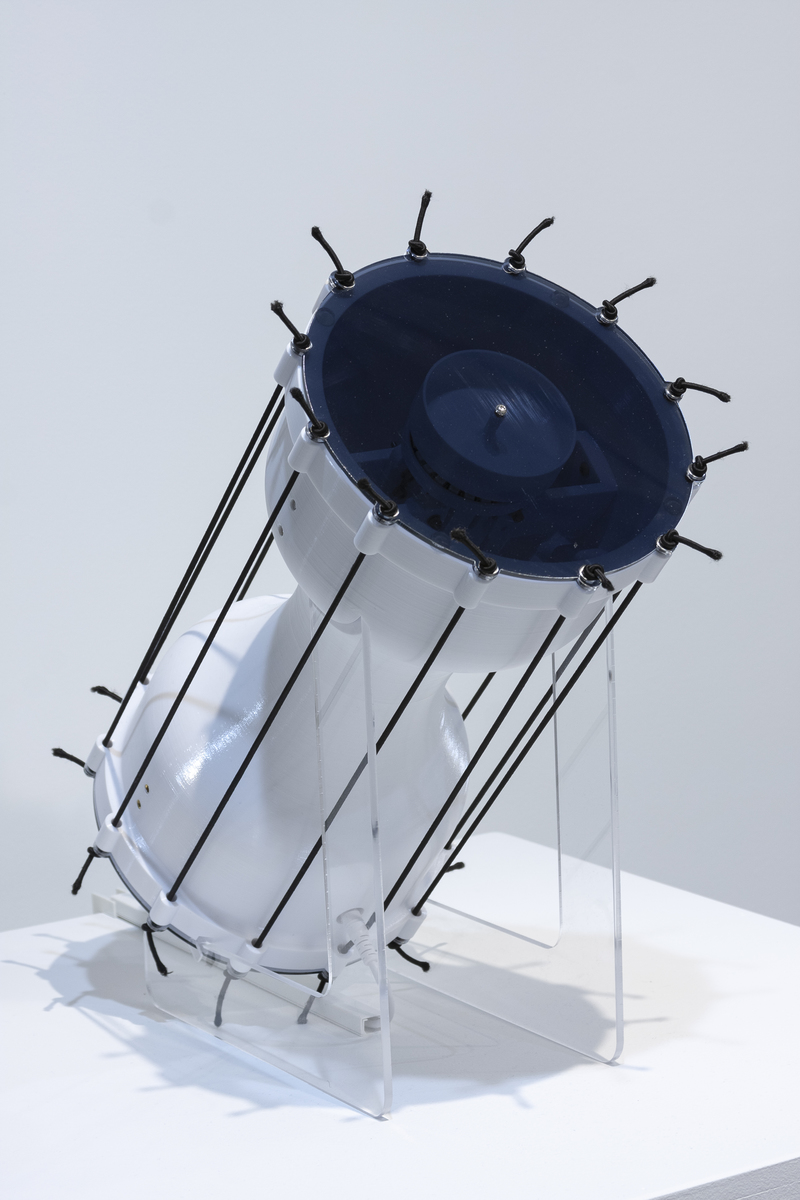 Christopher Dela Cruz and Eric Slyfield, Talking Drums, 2021, kinetic sculpture, 16″ x 8″ x 17″