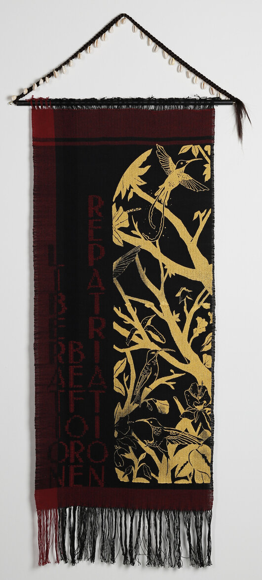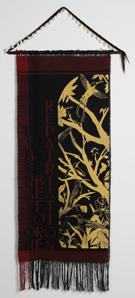 In pieces composed of print and textile, Birhanu and Morley explore their shared experiences and complex identities as Black Canadians. “Liberation before Repatriation,” the idea of dismantling Western colonial oppressions before returning to the origins of one’s ancestors, is given weight in a long black, red, and gold hand-woven textile piece; the weight of the message emphasized by the labour of creation. In Portals to our Liberated Futures, doorways appear over and over again, connecting us to conversations across time and space.