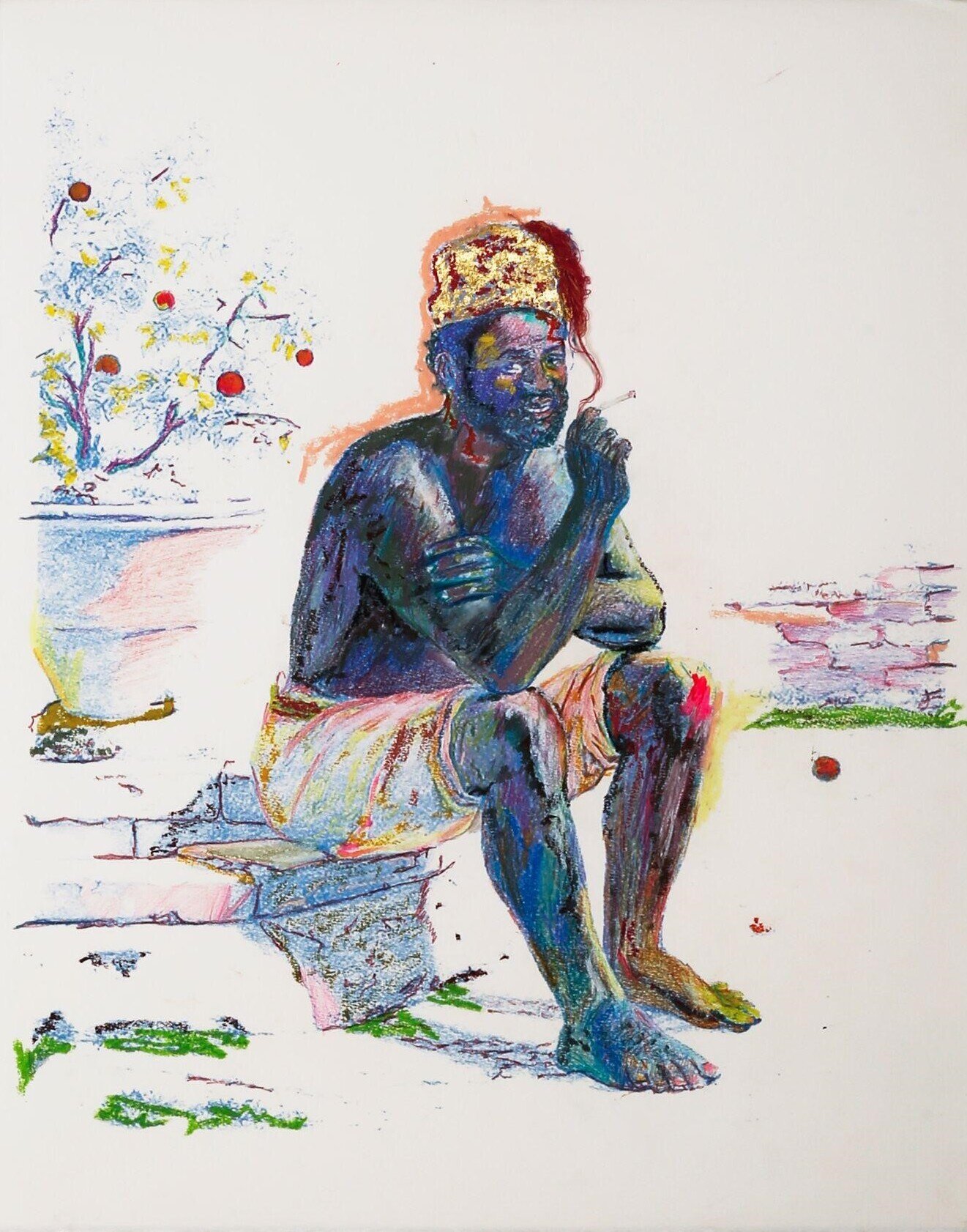 The criminal artist No.3 by Berirouche Feddal, is a stand-out piece in Conversation. At some distance, a man sits on a kind of stone ledge, wearing a gold hat, smoking a cigarette, and staring out at the viewer. Colourful paint strokes, in this work and others, nod to Fauvism and hints of Orientalism sneak through in the posture and clothing of the figure. As a piece of the larger collaboration, together these portraits can read like a conversation between Pavlis’ created present and Feddal’s created past, each character sharing stories that are as dissimilar as they are alike.