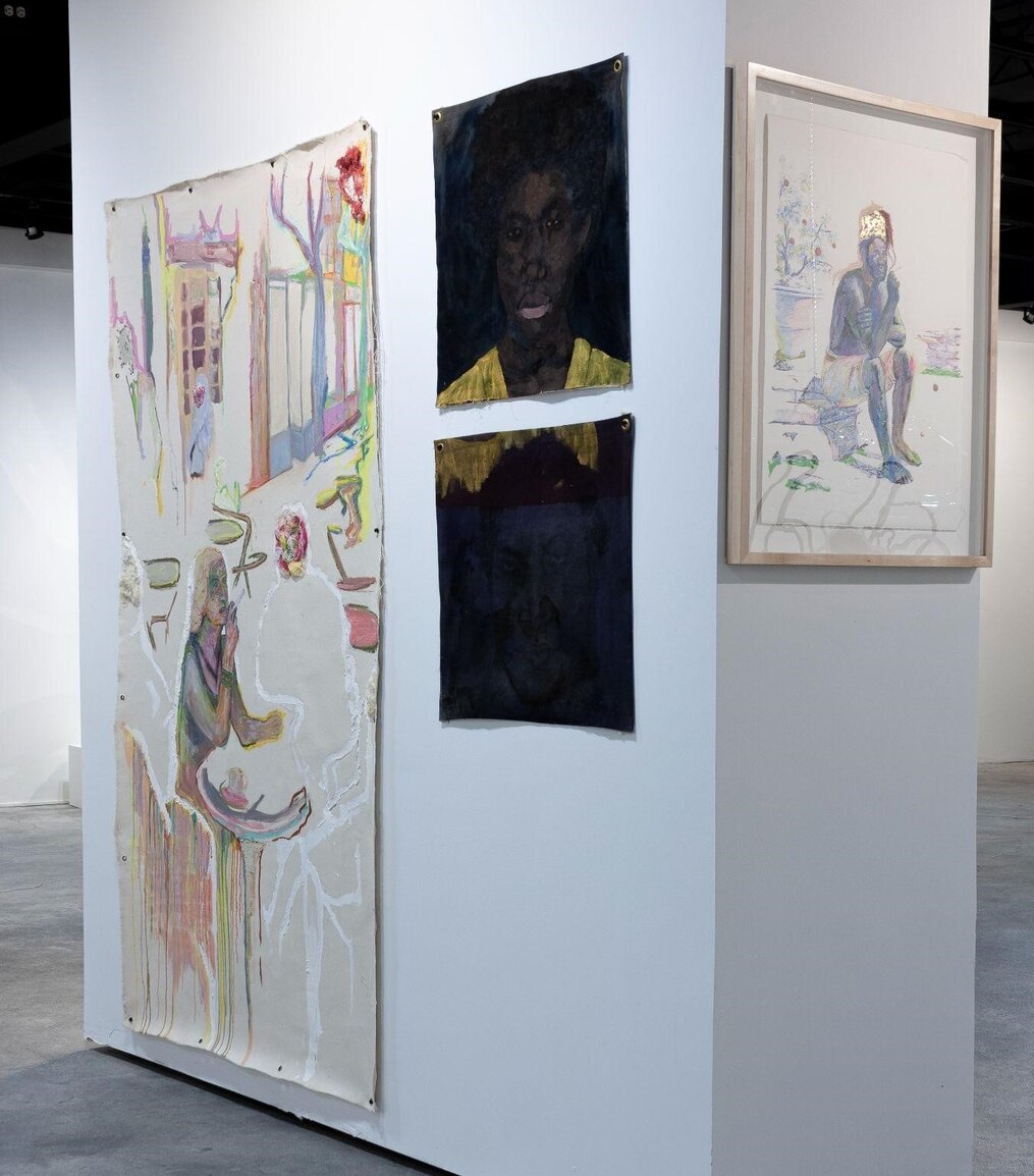 Portals to our Liberated Futures is well-placed by the gallery doors, echoing the physical entrance as a philosophical entrance into the space. A collaboration between artists Eva Birhanu and Khadijah Morley, this collection of works is the product of a call-and-response conversation from opposite ends of the country, both artists having a hand in all works.