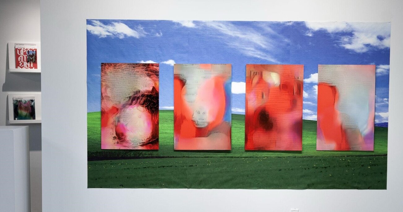 Art school peers, Guillaume Saur and Matty Flader, examine the opposing forces of the internet: the extremely universal and extremely niche experiences it provides. Most viewers will recognize the background of Saur and Flader’s collaboration piece; the most generic of generic Windows desktop images, green fields under a cloudy blue sky. On top of this backdrop are four red and grey prints, created by feeding photography to an AI algorithm to combine the works of Saur and Flader. Selected for the AI were previously under-appreciated works from the archives of the artists. The result is a series of final images that are largely unrecognizable to us—a private conversation in which only Saur and Flader know the spoken languages.