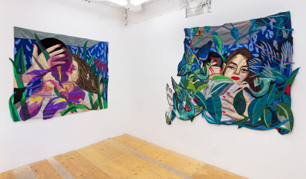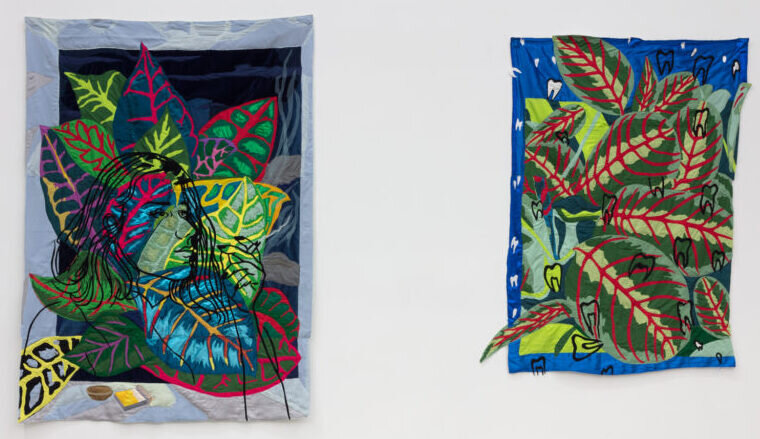 Hangama Amiri, Self-portrait with the Croton Petra Plants, 2021, Chiffon, muslin, cotton, polyester, silk, velvet, net mesh, colour pencil, and found fabric, 80″ x 58″ (left) & The Fallen Dream, 2021, Chiffon, muslin, cotton, polyester, and silk, 69.5″ x 56″ (right)