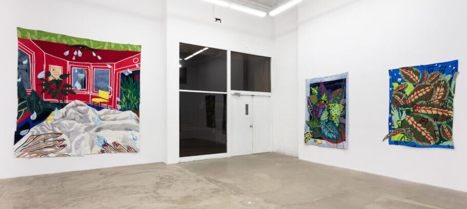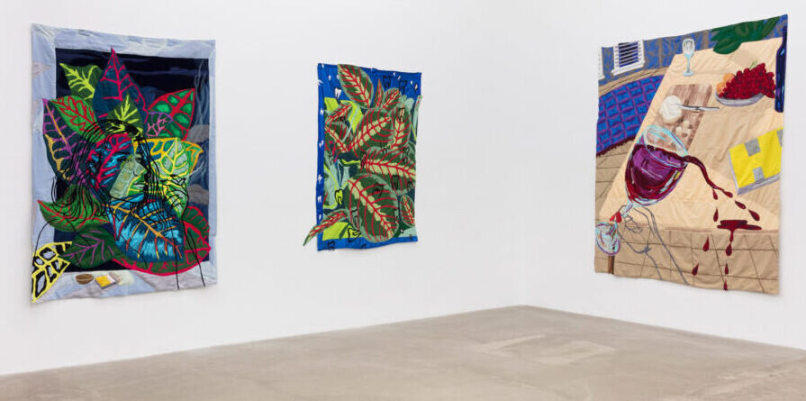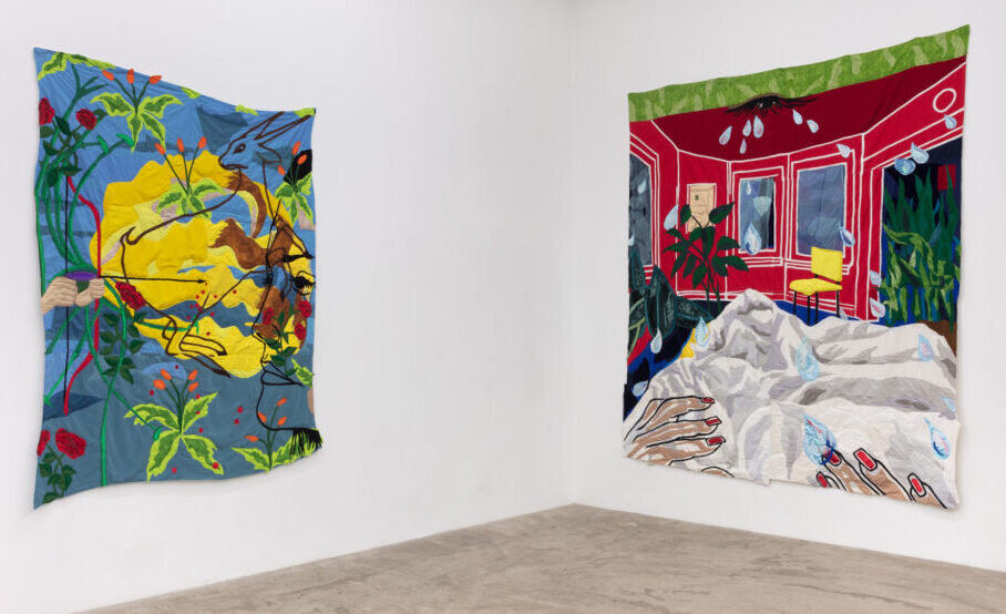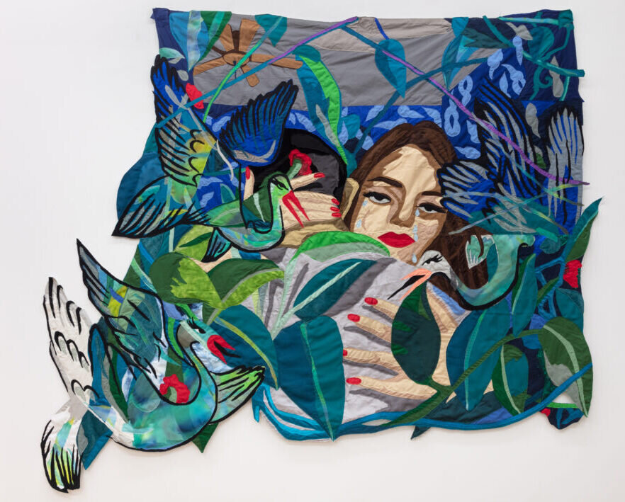 The show displays eleven large scale textiles that have a painterly approach, featuring bold and vivid colours. These works are immersive and imaginative, with fantastical elements and dreamlike motifs comprising foliage, domestic space, and metaphors for cultural memory, such as poured wine, parrots, tears and arrows. Similar to a mosaic, Amiri allows for everyday objects to tell her story, weaving together representations of life — believing that fabric has a generosity and “touch” that allows her to produce what paint and other mediums cannot.