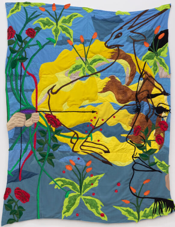 Hangama Amiri, Wounded Deer, 2021, chiffon, muslin, cotton, polyester, silk, suede, net mesh, and found fabric, 98″ x 75”