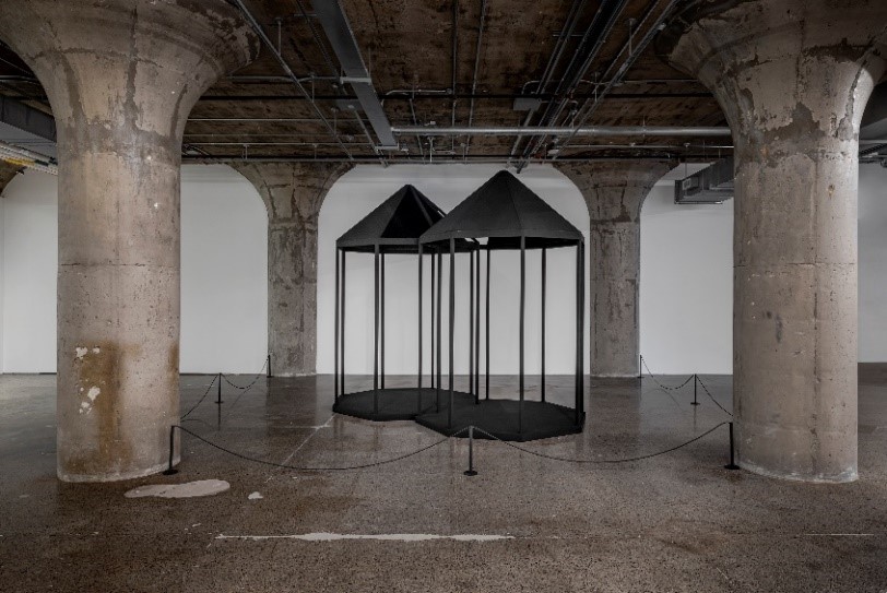 Native Art Department International, Double Gazebo (MOCA), 2021, painted steel and wood. Courtesy the artists. Photo Toni Hafkenscheid (installation view MOCA Toronto, 2021). On the third floor, theme: Mutation