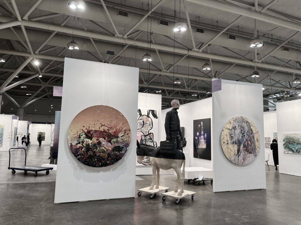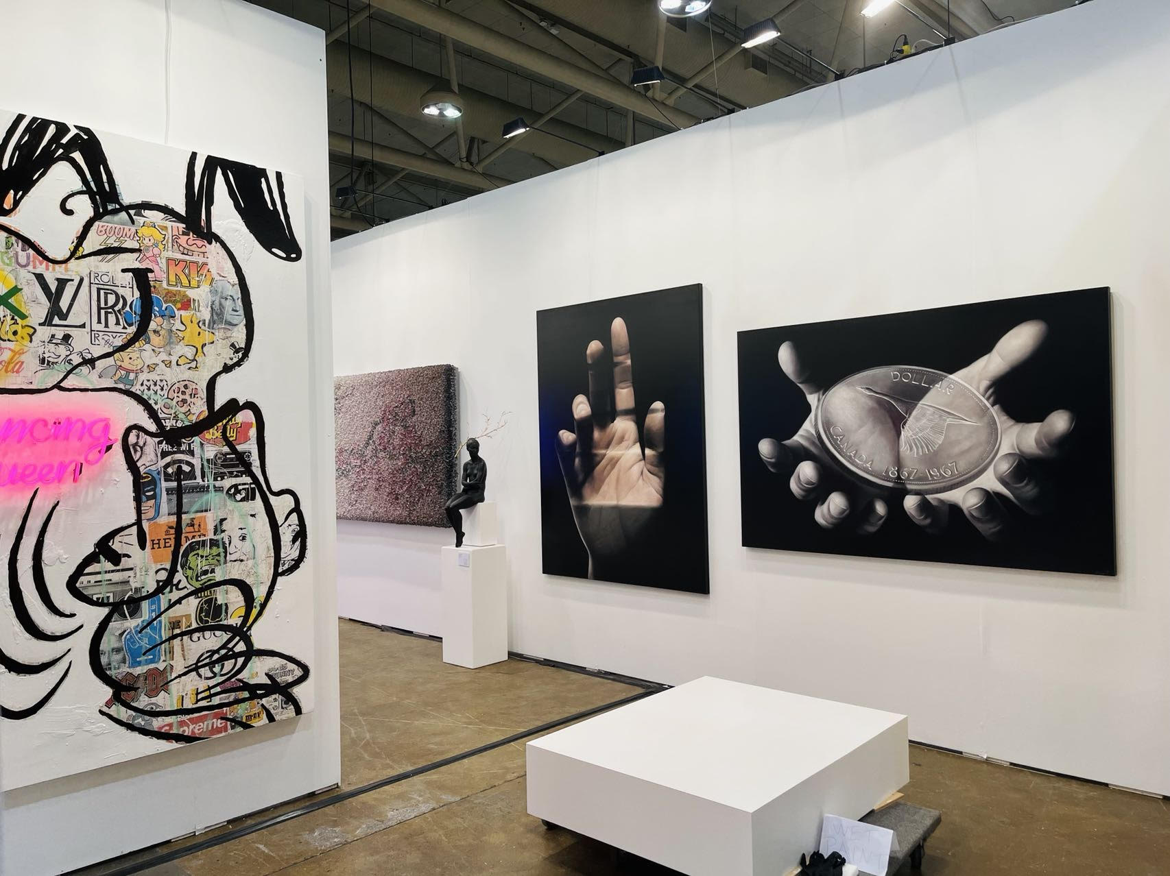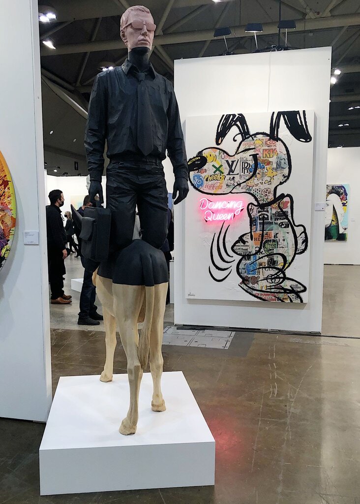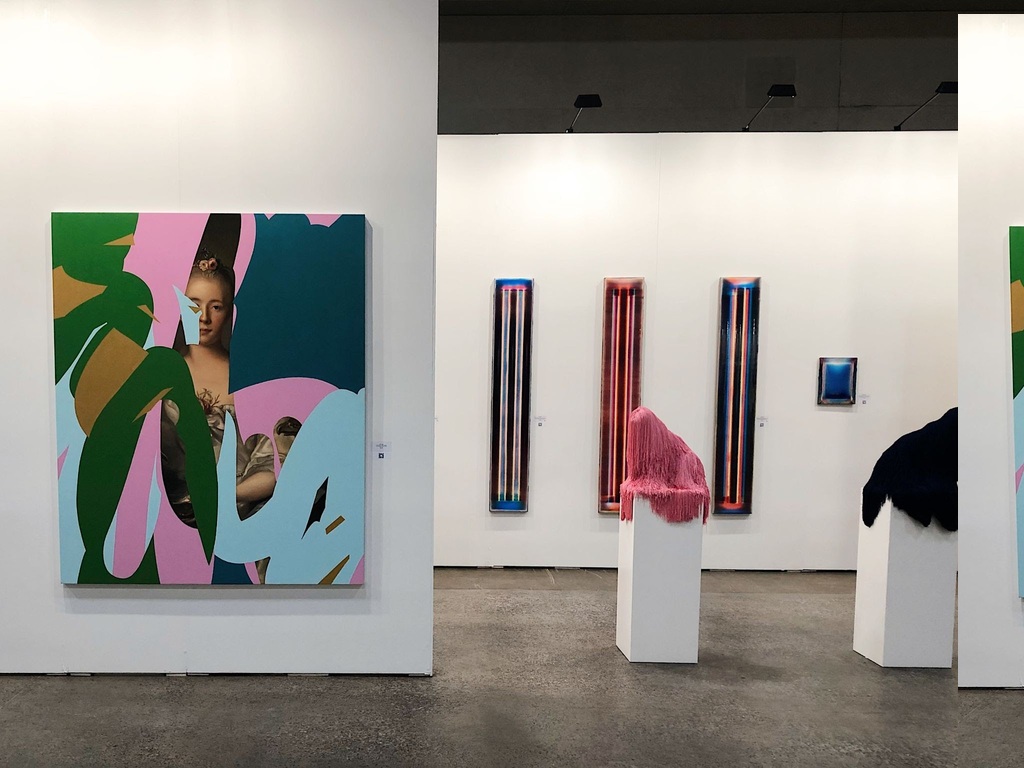 Installation View of Galerie LeRoyer, Montreal (Left: Willy Verginer, “Quello che io non ho è una camicia bianca,” 2015, Lindenwood and acrylic; Right: Rock Therrien, “Dancing Queen,” 2021, Mixed media on canvas, neon)