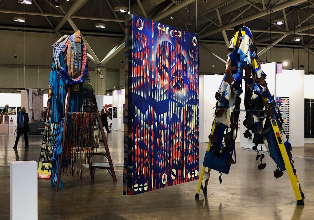 Jason Baerg, Optimal Futures, acrylic and tempera on laser cut canvas over ladder; Acrylic on wood, Fazakas Gallery, Vancouver