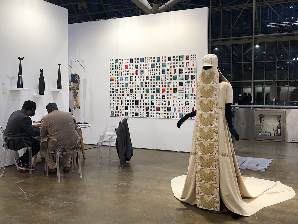 Installation View of Patel Brown, Toronto (Front Right: featuring Nep Sidhu and Nicolas Galanin, “No Pigs in Paradise,” 2016, mixed media, textiles by Sidhu and adornment by Galanin; Back Centre: Michael Dumontier and Neil Farber, “Library,” 2021, Acrylic and ink on MDF)