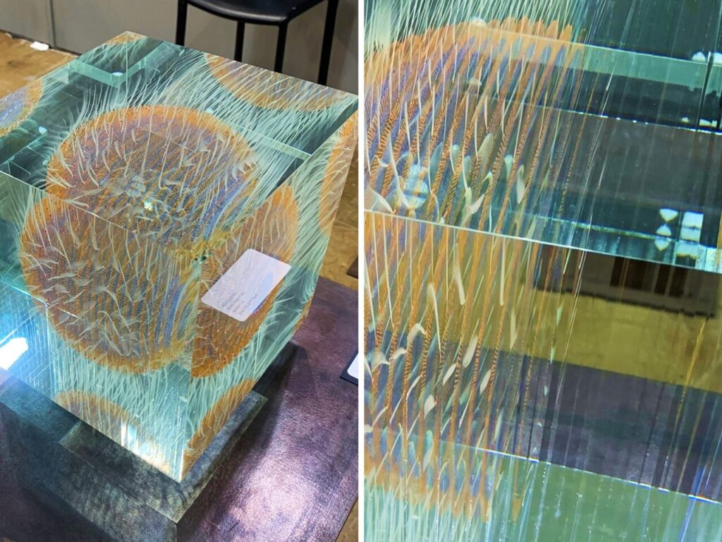 The Sandra Ainsley Gallery specializes in glass art. Near the front of the booth is a cube of glass by Wilfried Grootens that seems to contain an organic spherical object. The piece is made up of flat images on layers of glass that have been fused together. When you look from the side, the object within seems to vanish.