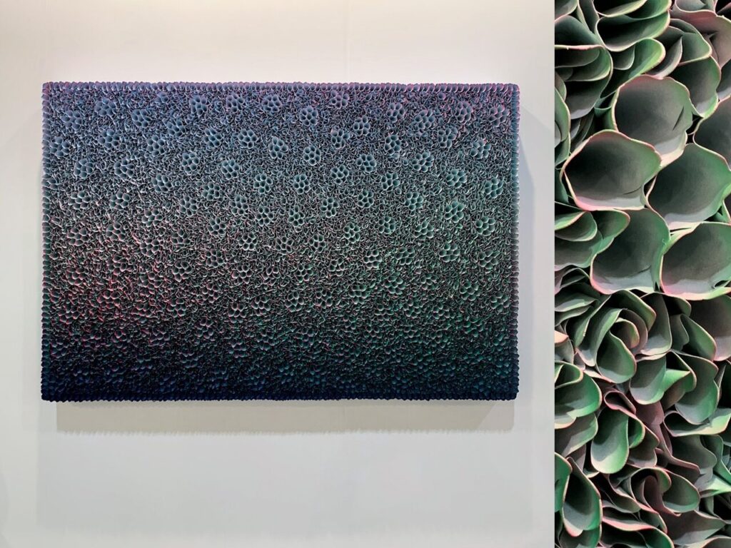 Zhuang Hong Yi’s sculptural painting Flowerbed 140 at Galerie Le Royer creates an intriguing visual effect as you move around. The surface is made up of coils and tubes that are covered in subtle washes of paint. Light and colour shift with each slight change of viewing angle.
