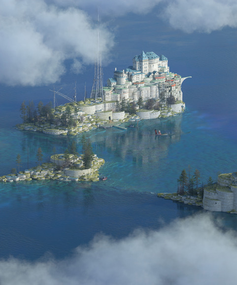In Between The Storms, the layering architecture seems to be built on an isolated island in the middle of the sea, and the moss coats everything, even the outer walls of the buildings. The collapsed rusty signal tower at the lower end of the small island, among other details, seem to suggest that this place may frequently be completely covered by water and what we see now is the scene at low tide. Borrett’s series of digital renderings is a manifestation that no matter how cities are manufactured by mankind, nature will not remain repressed.