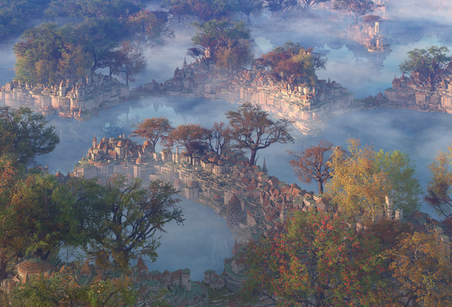 Gibraltar Cove depicts a small town on a bay surrounded by dead coral. This work seems to be different from the others with its melancholic atmosphere. There are also more realistic details like the lighthouse and the warm light radiating from the houses, as well as the grounded fishing boat. The nature in Borrett’s Hypernurnia series is always formidable. This one provides the viewers with a possibility for the co-existence of man and nature.