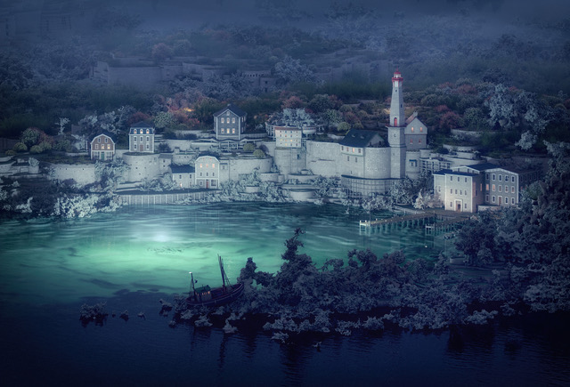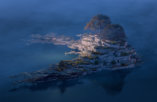 In Stranded, the outlandish stone construction with two huge trees at the top is more overwhelming with the deep undertone Borrett set for the work. This is one of the few works that have a human-like creature as the focal point, with a glowing body, standing silently on a pier extended from the island. I can not tell if he is a real human being, a lost soul or an alien who is trapped in this isolated island — the only expression it brings to me is of infinite loneliness.