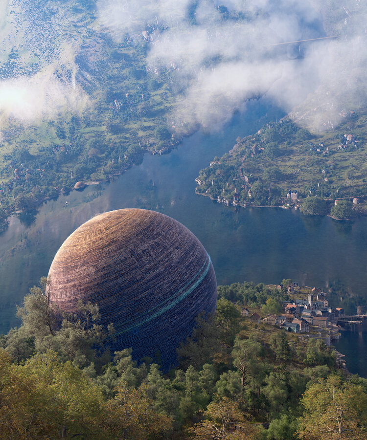 Working for the TV and film industry, Borrett’s work contains a strong sense of the cinematic view. I believe that his illustrations could be a continuous narrative about the decay of mankind, as the huge amount of water and infinite greenery may imply no humans are present. In Ynys Sfferau, an enormous extraterrestrial sphere has landed on earth in distinct contrast to a small town next to it. The sphere itself reminds me of the biblical Third Day when the Earth was no more than a sphere before it was covered by soil so plants could root and grow. It is like a womb, pregnant with many possibilities as well as dangers. The shadow on the water is also out of context in this otherwise realistic looking landscape that we are seeing from above, as though from the spaceship that just dropped this sphere. The oppression from the details and the endless landscape view is compelling.