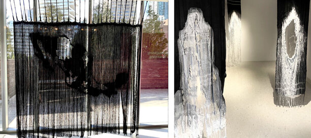 Claudia Chagoya, Unweaving Foundations, unraveled rebozo 2018, 7 x 9 inches (left) & Novem, 2019, Installation composed of rayon rebozos and salt, 8 x 2 inches (right)