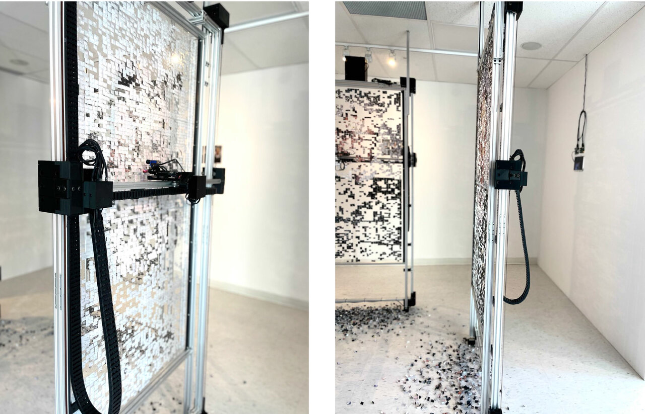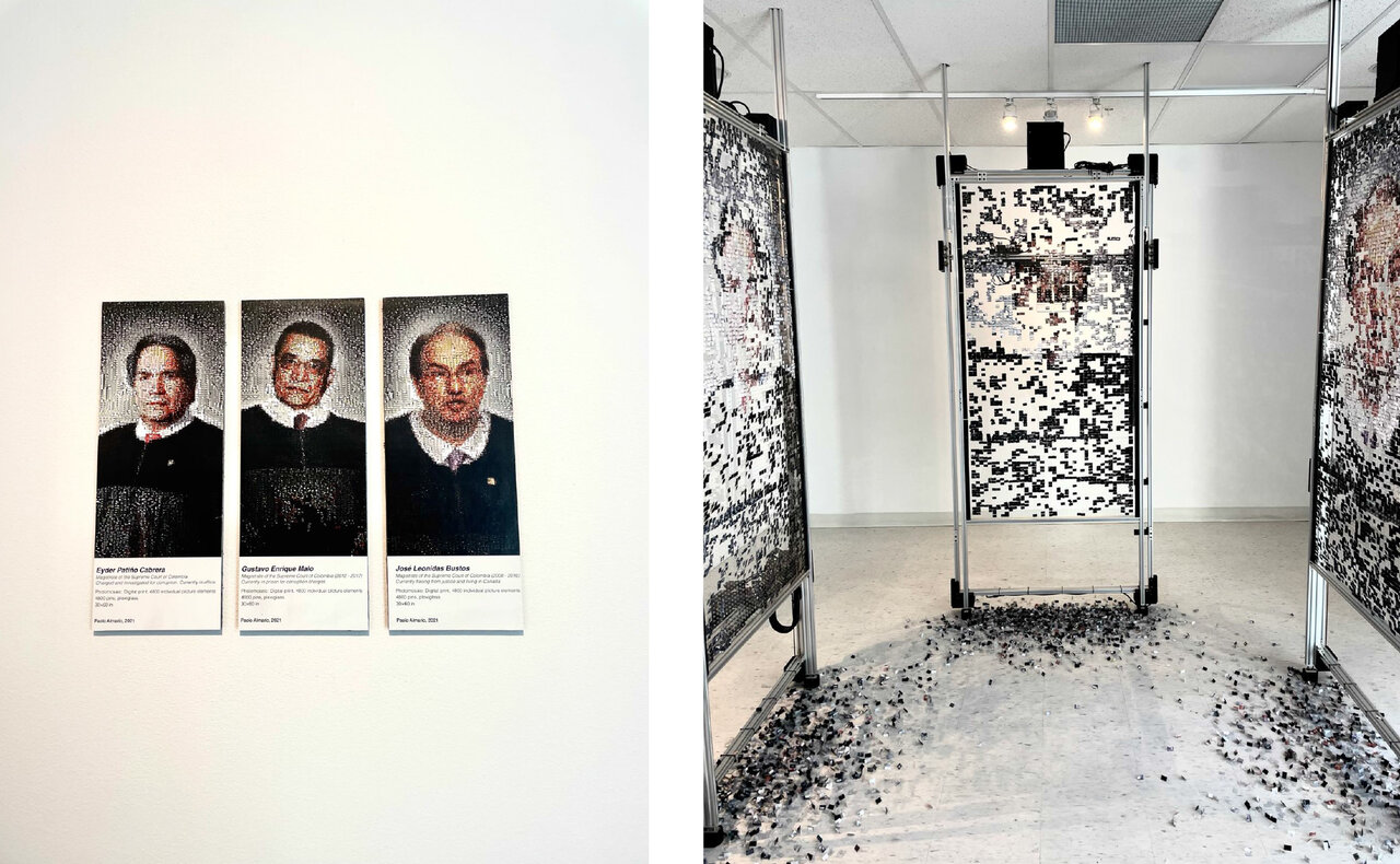 Taking center stage at the Sur Gallery stands Chicoutimi-based artist Paolo Almario’s Réformé (2021). In a compelling and personal digital installation, Almario uses three automated, ephemeral, self-destructive panels that depict the portraits of the three magistrates who falsely accused his father and detained him as a political prisoner in Columbia. The portraits are made up of pixelated snapshots of Almario’s attacked home (by the Revolutionary Armed Forces of Colombia) and his father’s jail cell in which he spent nine years. In addition, the automated machine physically destroys the “pixelated” panels making the installation go beyond just the false accusations of his father to uncover a dark and corrupt system. Pieces of the panels line the gallery floors, representing Almario’s quest to have his father released from prison and his own process of mourning. One truly needs to see for him/herself just how striking this installation is.