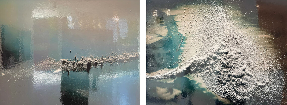 In Novem, Chagoya uses the rebozo again but with the element of salt. The crystallized salt on the rebozos resembles bones, while the fibers of the shawl correspond to women’s hair — referencing the subjects and their decomposition. This powerful piece, clearly denounces the inexplicable acts on women’s bodies. To both cleanse, freeze, decompose and preserve, the component of salt is indispensable in the process of mourning.