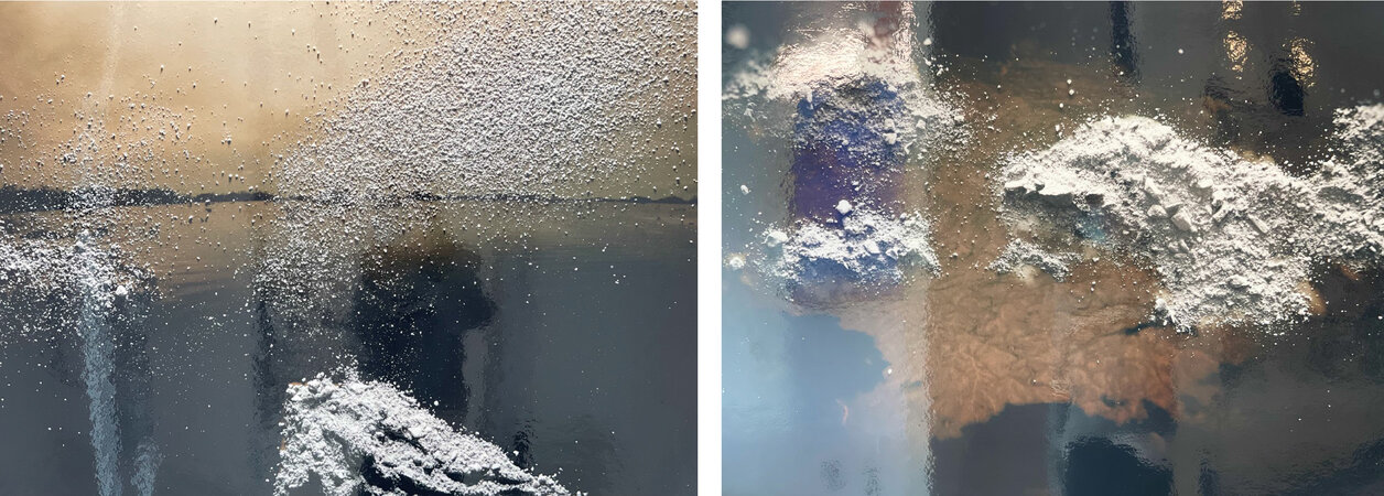 Toronto-based artist Laura Barrón offers the photographic series, Palimpsest (2012). The title alludes to the nature of the subject, a sublime landscape covered with the ashes of the artist’s father. As a way to grieve and commemorate her late father, Laura Barrón imbeds her father’s ashes directly into her photographic practice and life’s work. She offers her way of mourning for a loved one inthis series, bringing together the living with the dead.