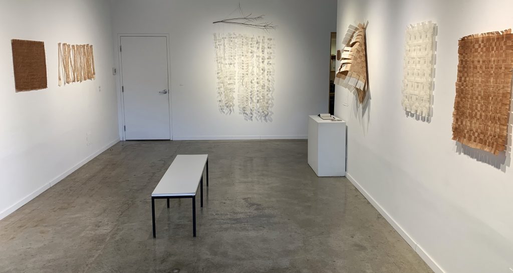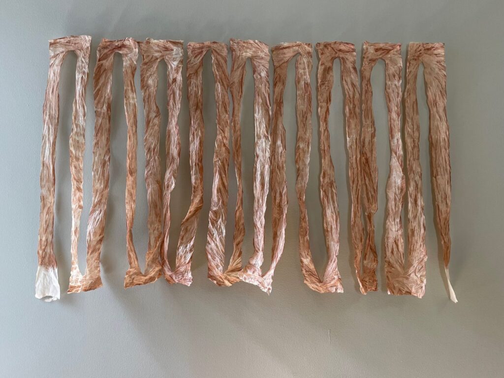 Looking at the pieces it might not be apparent to the viewers that they have stories hidden in them. In Unspun Ruptash was seeking to investigate the doing and the undoing of a sheet of washi by using methods of thread spun, coloring and dying it with kakishibu; then turning the paper back into its sheet format.