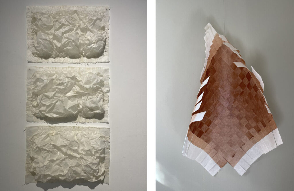 Susan Ruptash, Waxing, Sekishu-banshi Tsuru washi with konnyaku, 42 x 18 x 5 inches (left) and X, Moriki kozo washi with kakishibu, 42 x 22 x 18 inches (right)