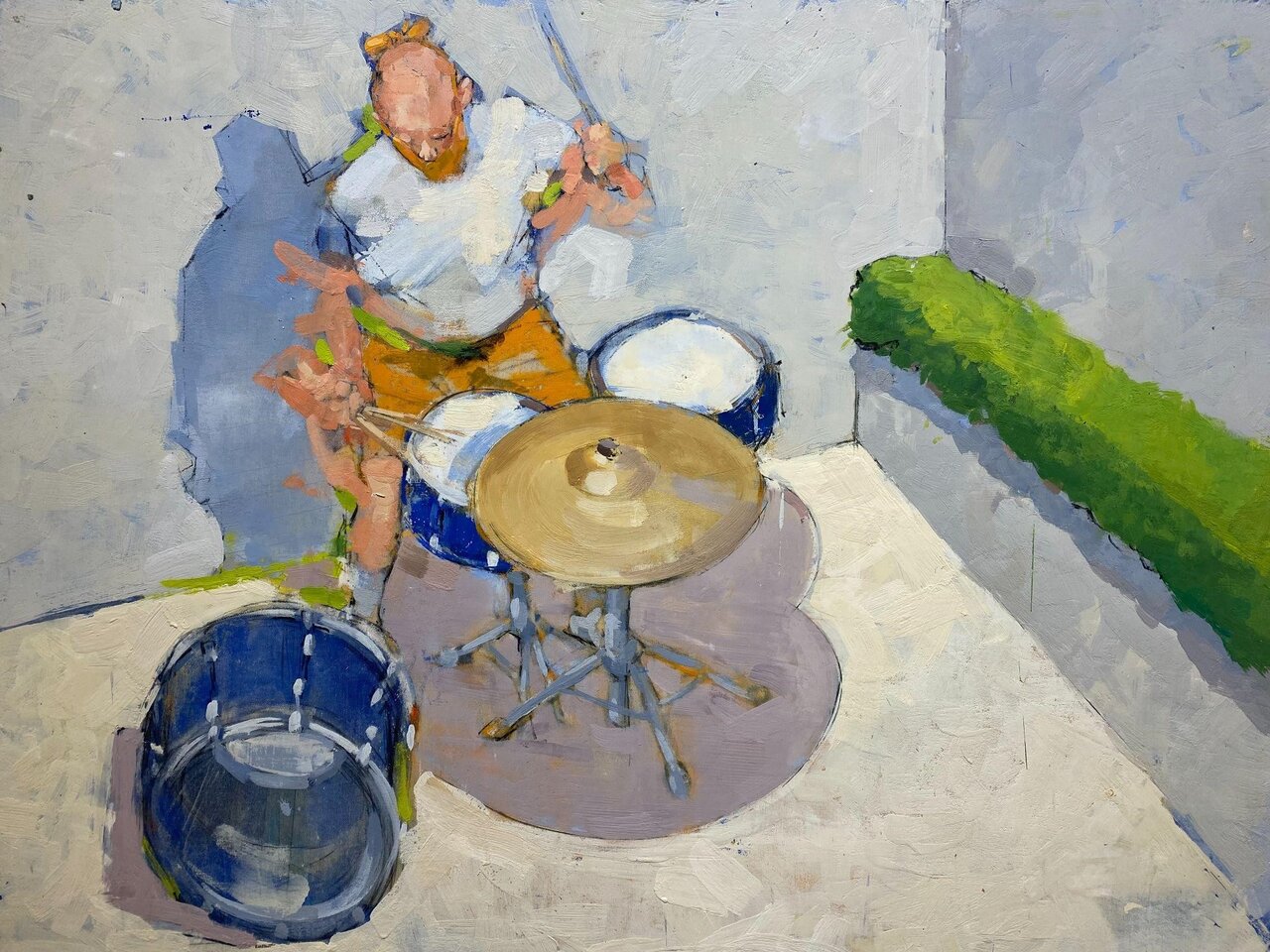 Drummer, 2021, encaustic on canvas mounted on panel, 40” x 40”
