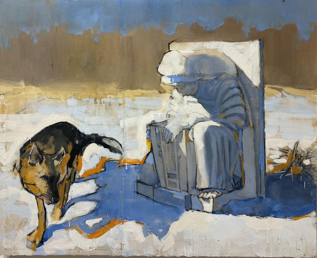 The composition and the rendering of colours in LINKLATzzER’S Valley #3 reveal a strong sense of sadness. It pictures only a statue and a dog. The landscape is stylized, the dark blue shadow is surrounded by bright orange, very much like the last glance of the light before sunset. The sculpture, resembling Duane Linklater’s in Don River Valley Park, is a hunched figure made of stone, maybe sleeping here as the ‘zz’ of the title might suggest. The brown trees in the background are most likely dead, the only living thing is the dog. What is it doing here? Bourke left it for the viewer’s imagination to create the narrative and the possibility of individualized interpretation makes the painting even more mysterious and attractive.