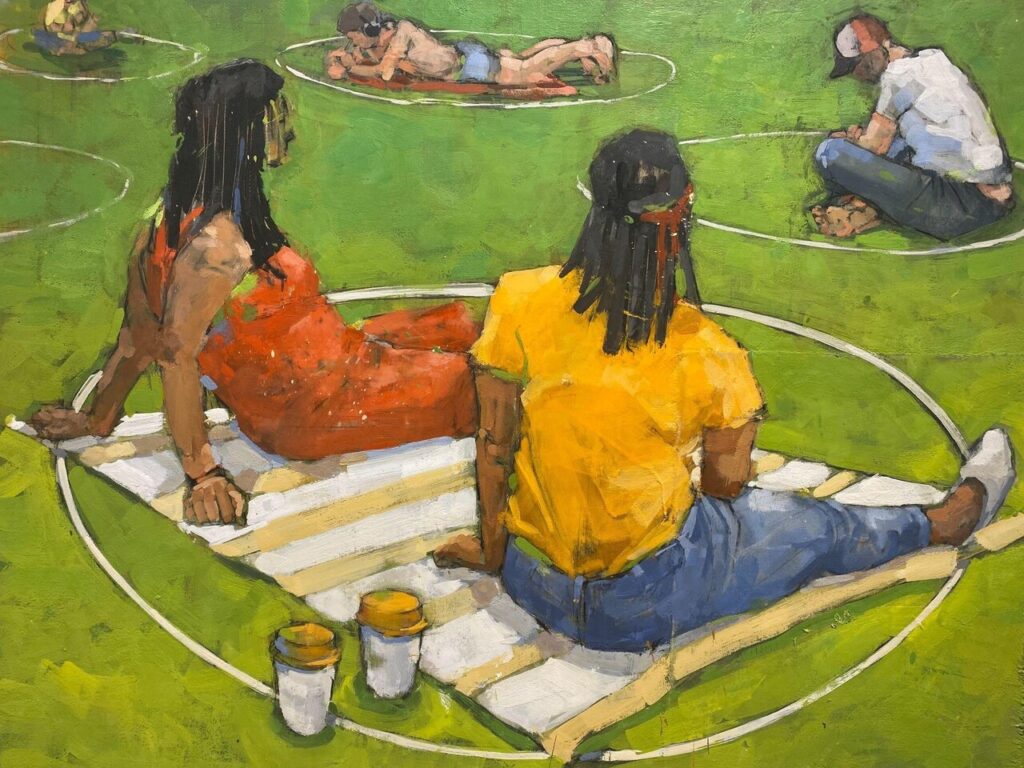 Jim Bourke captures the static in the dynamic. Although his paintings are not strictly realistic, he still depicts the most relevant details of the scenes and the expressions of his characters. The life before COVID seems so far away, and people must have recognized by now that everyday routines will not be the same as they were before for a long while. Although the epidemic has made our physical distance from one another further, the power of love and caring has brought our hearts closer to each other. What makes Bourke’s paintings so enchanting is that he is able to show closeness even when picturing distancing.