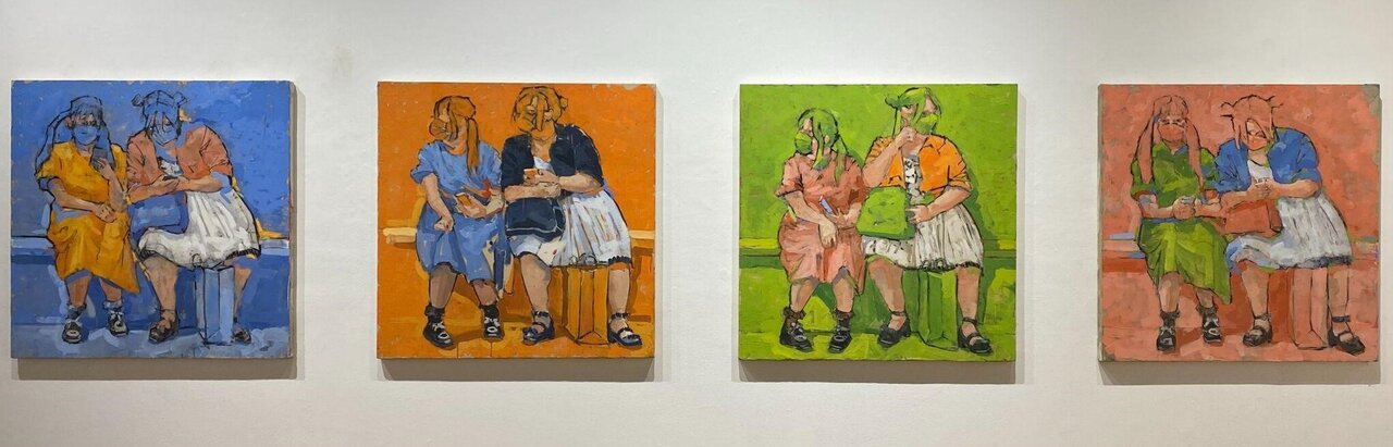 In many of Bourke’s paintings the dynamic movements of people are very engaging. In Subway Bench (2021) the two figures wear similar shoes and pants but their relationship ends there. Even though they may be close to each other, they are focused on their cell phones – accentuating distancing and loneliness.